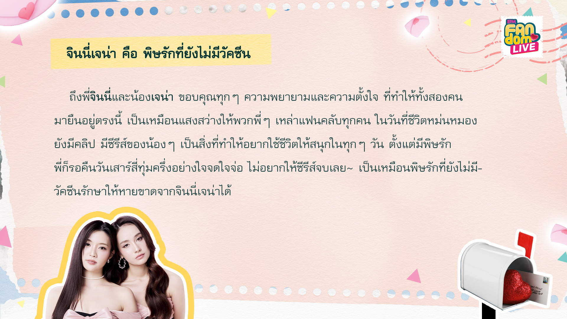 เด็กสองคนที่ไม่มีเพียงแค่ความสวย น่ารัก แต่ยังเต็มไปด้วยความสามารถและความตั้งใจ ทุ่มเทในการทำงาน แม้พี่จะมารู้จักพวกหนูช้า แต่พี่ก็เชื่อเรื่องจังหวะของชีวิตคนและนี่ก็เป็นเวลาของจินนี่และเจน่า ดอกไม้ที่กำลังเบ่งบานตามฤดูกาล ขอบคุณในความแสนดี ในความรักของพวกหนูที่เห็นคุณค่าในแฟนคลับทุกคน พี่เชื่อว่าพวกหนูรับรู้และเห็นทุกอย่างที่แฟนคลับทำให้เสมอ จะคอยซัพพอร์ตพวกหนูนะคะ ขอบคุณจินนี่เจน่าที่เกิดมาให้ได้รักนะ