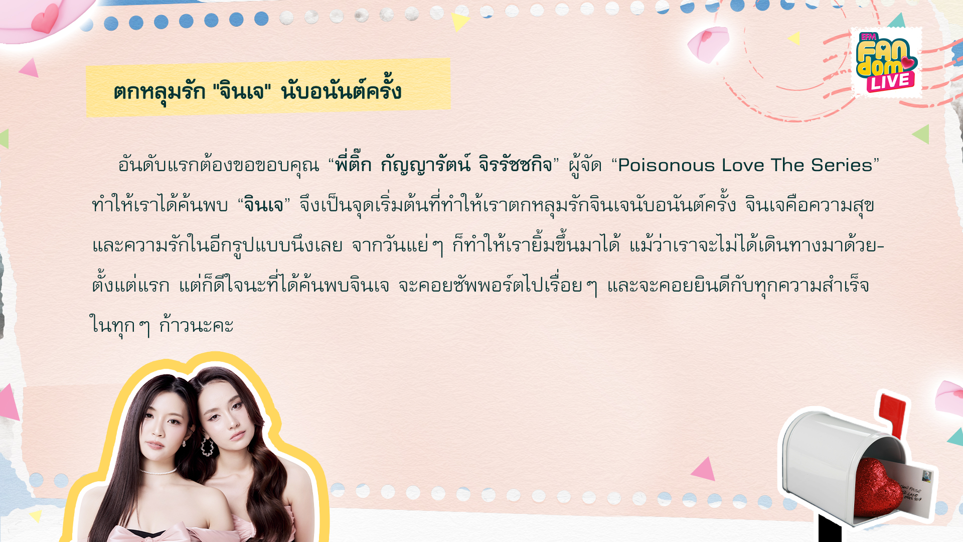 อันดับแรกต้องขอขอบคุณ “พี่ติ๊ก กัญญารัตน์ จิรรัชชกิจ” ผู้จัด “Poisonous Love The Series” ทำให้เราได้ค้นพบ “จินเจ” จึงเป็นจุดเริ่มต้นที่ทำให้เราตกหลุมรักจินเจนับอนันต์ครั้ง จินเจคือความสุข และความรักในอีกรูปแบบนึงเลย จากวันแย่ๆ ก็ทำให้เรายิ้มขึ้นมาได้ แม้ว่าเราจะไม่ได้เดินทางมาด้วยตั้งแต่แรก แต่ก็ดีใจนะที่ได้ค้นพบจินเจ จะคอยซัพพอร์ตไปเรื่อยๆ และจะคอยยินดีกับทุกความสำเร็จในทุกๆ ก้าวนะคะ”