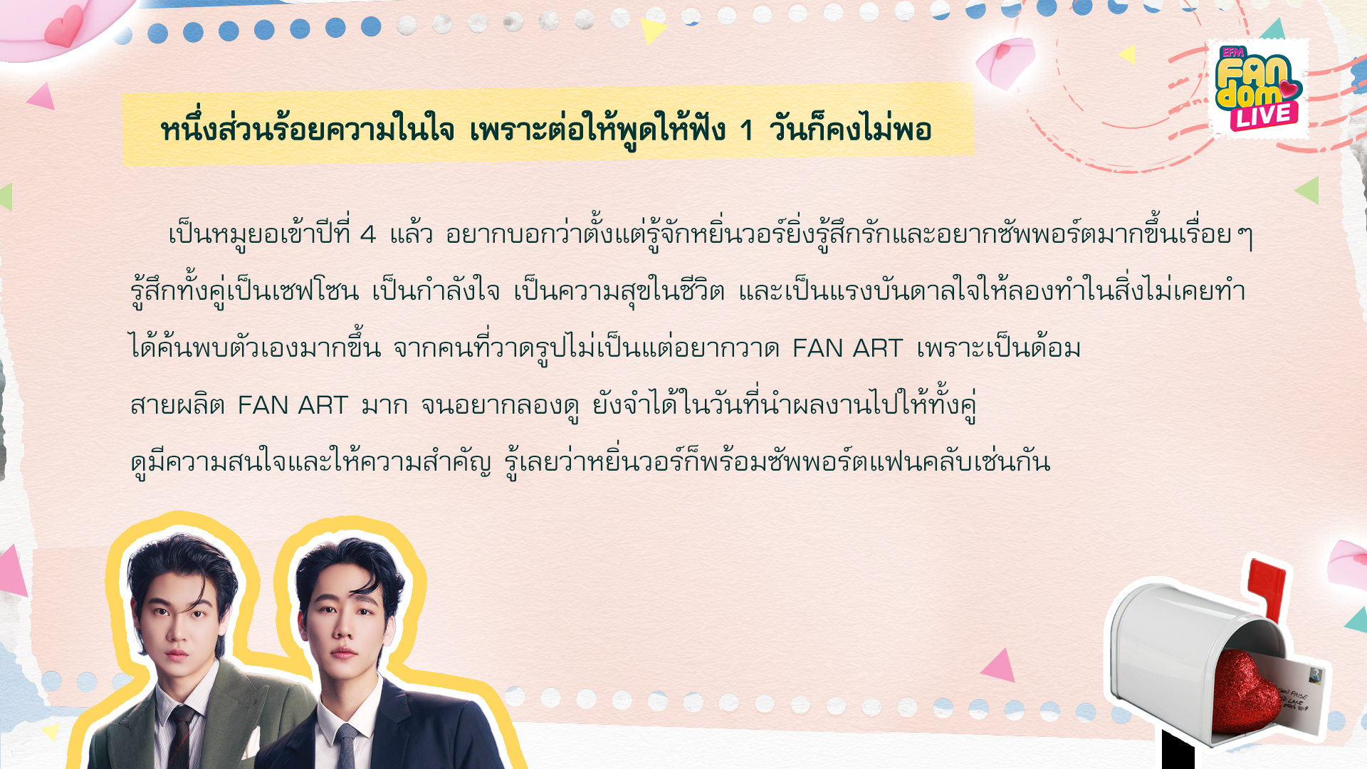 เป็นหมูยอเข้าปีที่ 4 แล้ว อยากบอกว่าตั้งแต่รู้จักหยิ่นวอร์ยิ่งรู้สึกรักและอยากซัพพอร์ตมากขึ้นเรื่อยๆ รู้สึกทั้งคู่เป็นเซฟโซน เป็นกำลังใจ เป็นความสุขในชีวิต และเป็นแรงบันดาลใจให้ลองทำในสิ่งไม่เคยทำ ได้ค้นพบตัวเองมากขึ้น จากคนที่วาดรูปไม่เป็นแต่อยากวาด FAN ART เพราะเป็นด้อมสายผลิต FAN ART มาก จนอยากลองดู ยังจำได้ในวันที่นำผลงานไปให้ทั้งคู่ ดูมีความสนใจและให้ความสำคัญ รู้เลยว่าหยิ่นวอร์ก็พร้อมซัพพอร์ตแฟนคลับเช่นกัน”
