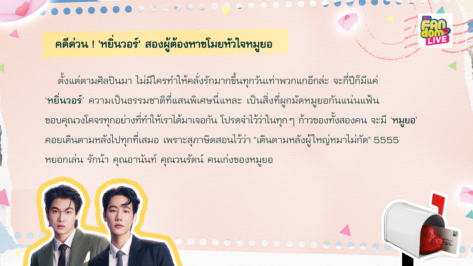 Since I've started following artists, no one makes me fall in love with them more and more each day than you all. No matter how many years pass, my heart will always belong to 'YinWar.' It’s this unique connection that keeps MooYor so tightly woven together. I’m incredibly grateful for the paths that have brought us together. Always remember that wherever you two go, ‘MooYor’ will be right behind you, just like the saying goes: "If you follow an adult, the dog won't bite"—just kidding! Love you both, Uncle Anan and Khun Wanarat, as well as all the talented individuals at MooYor.