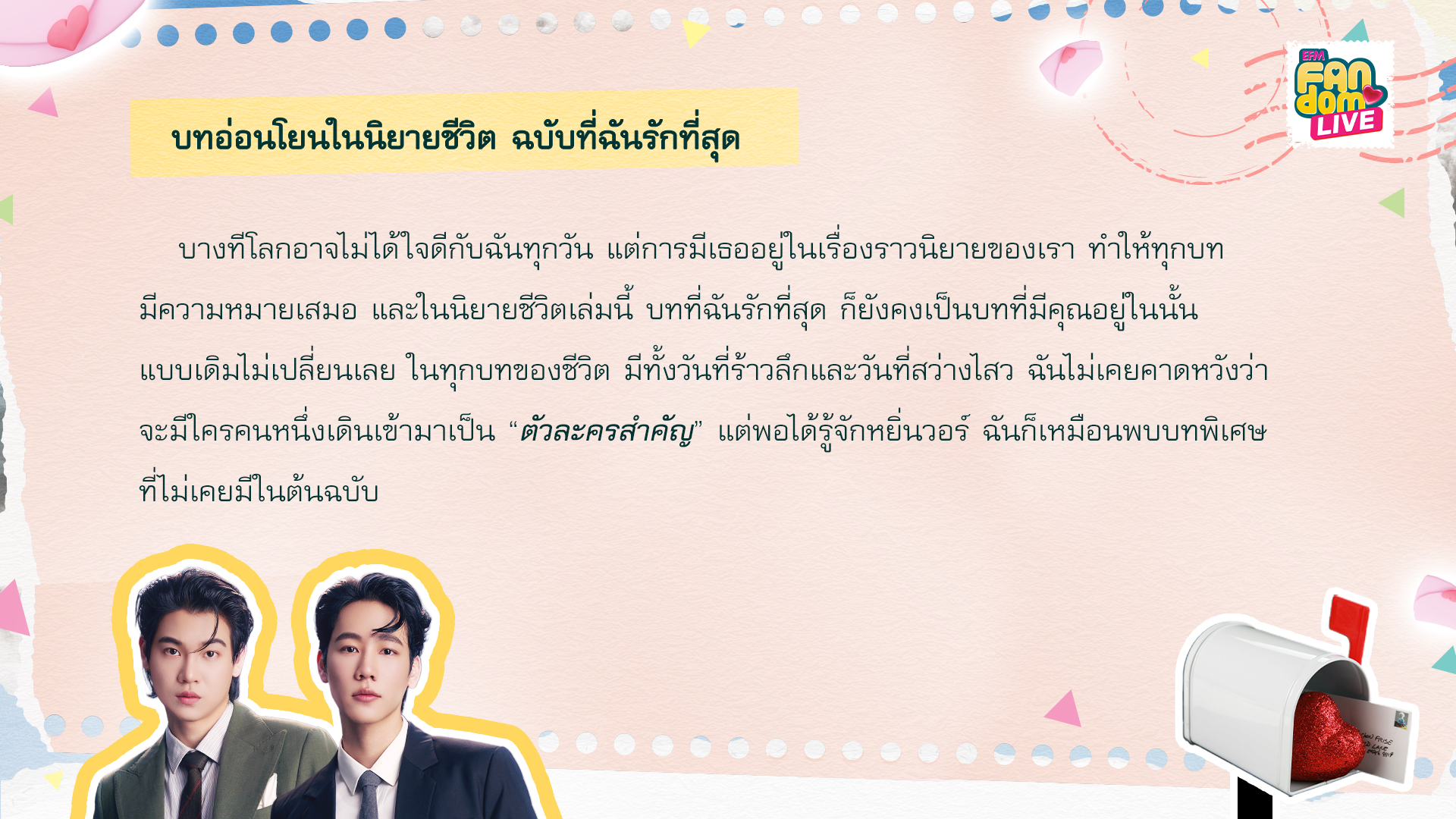 บางทีโลกอาจไม่ได้ใจดีกับฉันทุกวัน แต่การมีเธออยู่ในเรื่องราวนิยายของเรา ทำให้ทุกบทมีความหมายเสมอ และในนิยายชีวิตเล่มนี้ บทที่ฉันรักที่สุด ก็ยังคงเป็นบทที่มีคุณอยู่ในนั้น แบบเดิมไม่เปลี่ยนเลย ในทุกบทของชีวิต มีทั้งวันที่ร้าวลึกและวันที่สว่างไสว ฉันไม่เคยคาดหวังว่าจะมีใครคนหนึ่งเดินเข้ามาเป็น “ตัวละครสำคัญ” แต่พอได้รู้จักหยิ่นวอร์ ฉันก็เหมือนพบบทพิเศษที่ไม่เคยมีในต้นฉบับ