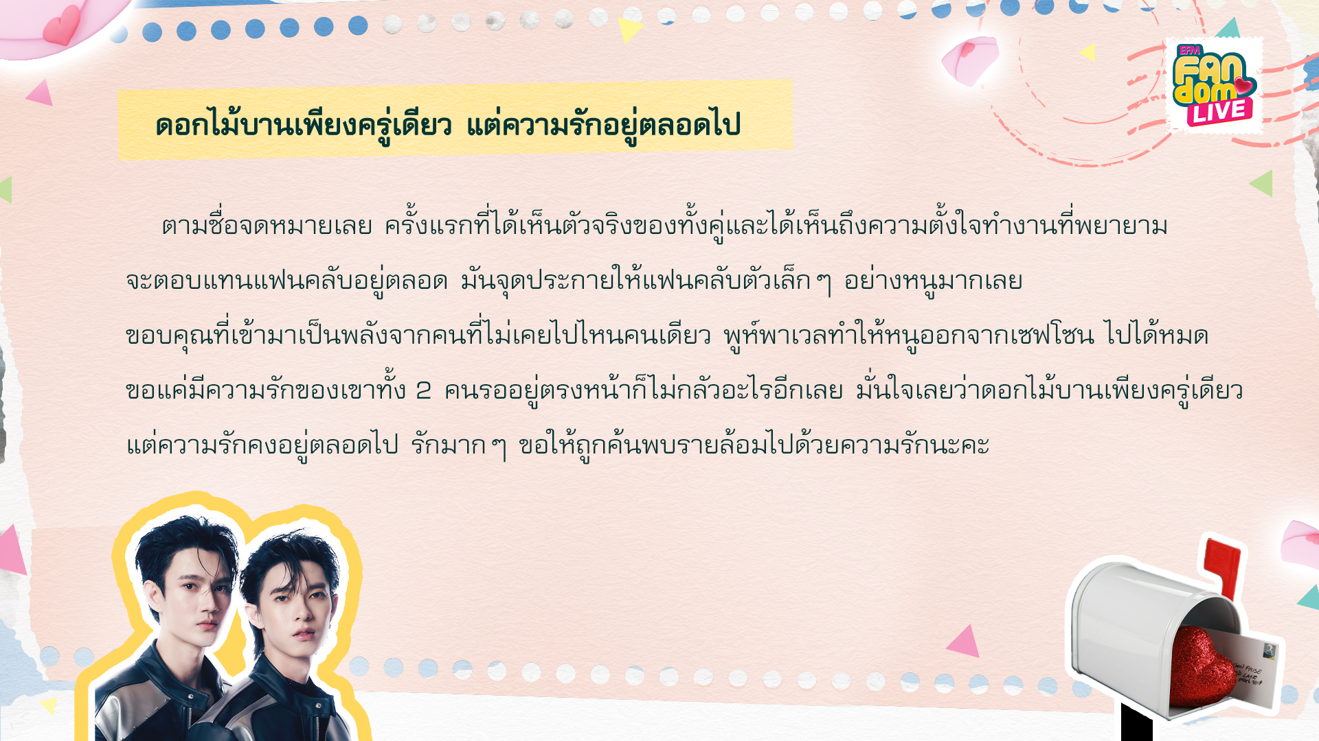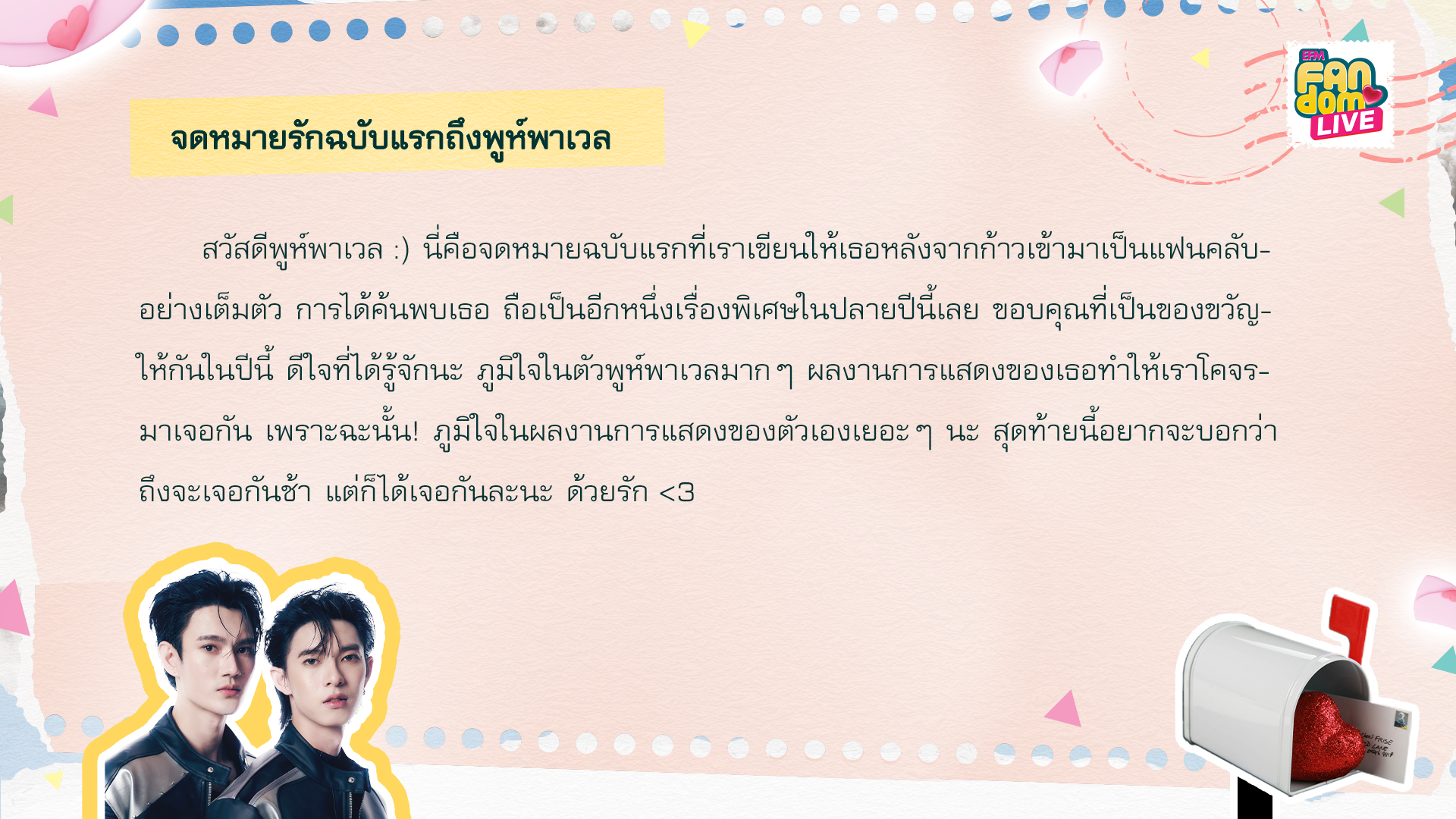ตามชื่อจดหมายเลย ครั้งแรกที่ได้เห็นตัวจริงของทั้งคู่และได้เห็นถึงความตั้งใจทำงานที่พยายามจะตอบแทนแฟนคลับอยู่ตลอด มันจุดประกายให้แฟนคลับตัวเล็กๆอย่างหนูมากเลย ขอบคุณที่เข้ามาเป็นพลังจากคนที่ไม่เคยไปไหนคนเดียว พูห์พาเวลทำให้หนูออกจากเซฟโซน ไปได้หมด ขอแค่มีความรักของเขาทั้ง 2 คนรออยู่ตรงหน้าก็ไม่กลัวอะไรอีกเลย มั่นใจเลยว่าดอกไม้บานเพียงครู่เดียว แต่ความรักคงอยู่ตลอดไป รักมากๆ ขอให้ถูกค้นพบรายล้อมไปด้วยความรักนะคะ”
