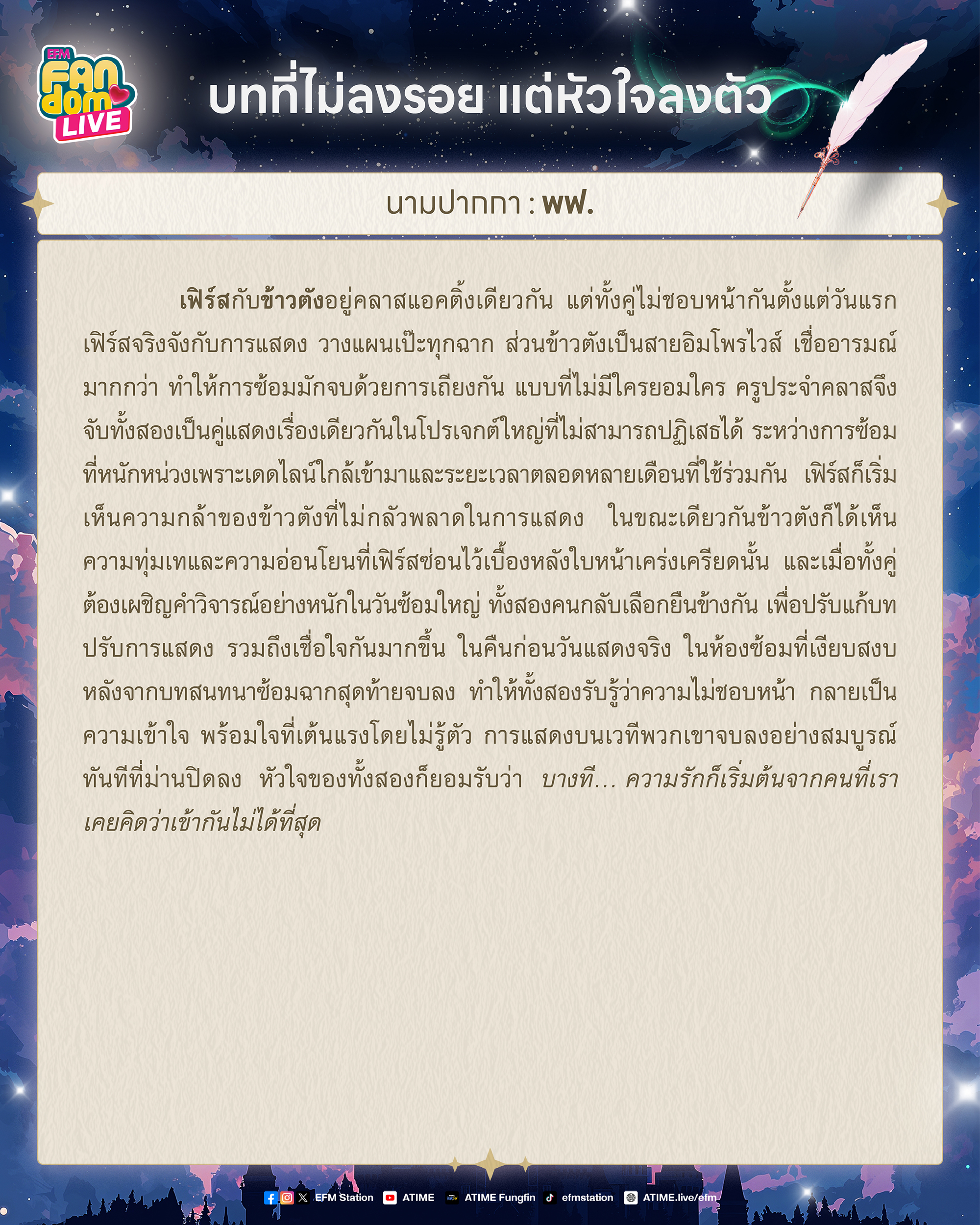 รายการ EFM FANDOM LIVE [ 5 กุมภาพันธ์ 2569 ] ค่ำคืนนี้มารับความน่ารักใจฟู ไปกับ “เฟิร์ส - ข้าวตัง” ที่จะมาเติมรอยยิ้ม ความสดใสให้กับแฟน ๆ ไปพร้อมกับ 2 ดีเจสาวสวย “ดีเจดาว” และ “ดีเจแนน”