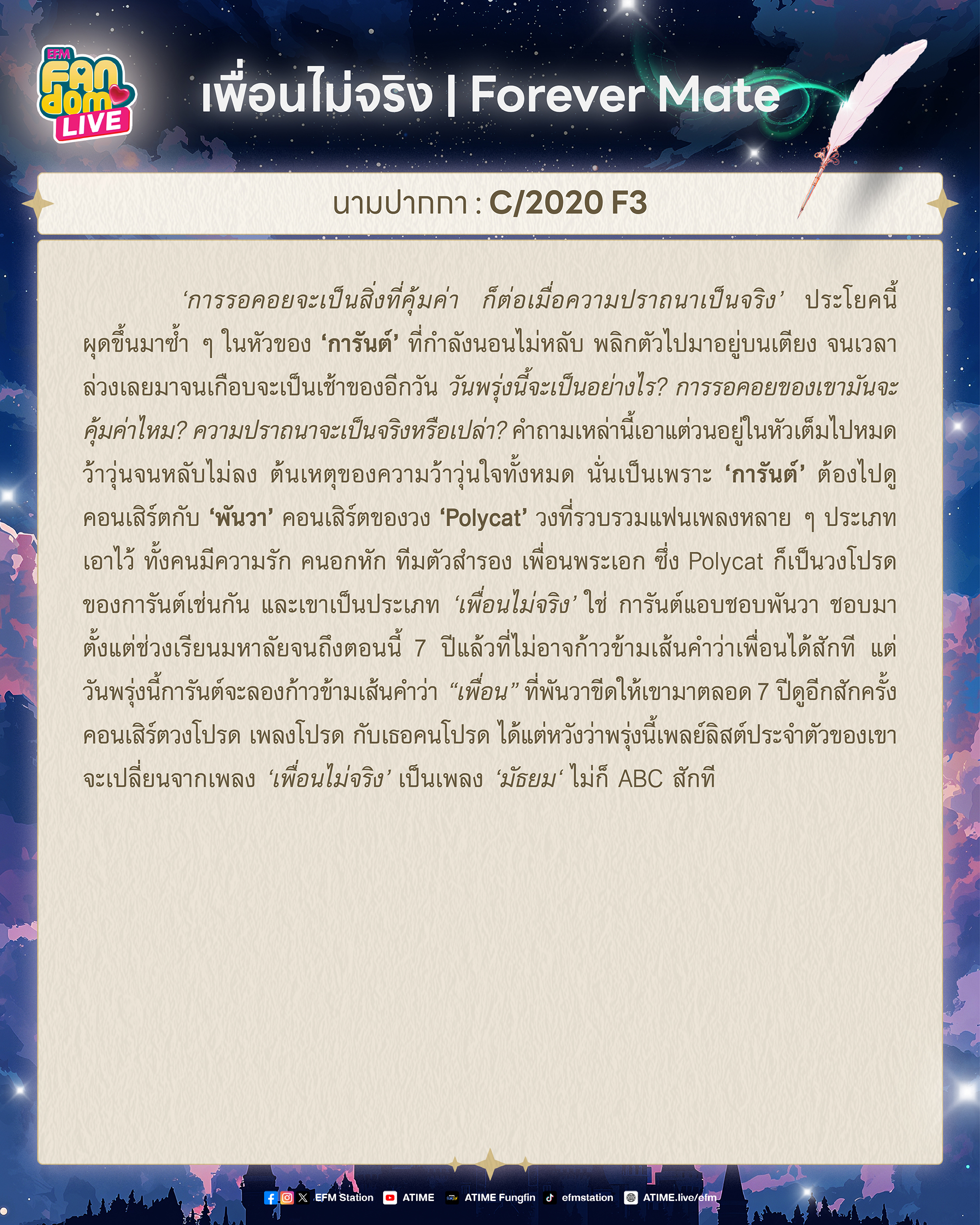‘การรอคอยจะเป็นสิ่งที่คุ้มค่า ก็ต่อเมื่อความปราถนาเป็นจริง’ ประโยคนี้ผุดขึ้นมาซ้ำ ๆ ในหัวของ ‘การันต์’ ที่กำลังนอนไม่หลับ พลิกตัวไปมาอยู่บนเตียง จนเวลาล่วงเลยมาจนเกือบจะเป็นเช้าของอีกวัน วันพรุ่งนี้จะเป็นอย่างไร? การรอคอยของเขามันจะคุ้มค่าไหม? ความปราถนาจะเป็นจริงหรือเปล่า? คำถามเหล่านี้เอาแต่วนอยู่ในหัวเต็มไปหมด ว้าวุ่นจนหลับไม่ลง ต้นเหตุของความว้าวุ่นใจทั้งหมด นั่นเป็นเพราะ ‘การันต์’ ต้องไปดูคอนเสิร์ตกับ ‘พันวา’ คอนเสิร์ตของวง ‘Polycat’ วงที่รวบรวมแฟนเพลงหลาย ๆ ประเภทเอาไว้ ทั้งคนมีความรัก คนอกหัก ทีมตัวสำรอง เพื่อนพระเอก ซึ่ง Polycat ก็เป็นวงโปรดของการันต์เช่นกัน และเขาเป็นประเภท ‘เพื่อนไม่จริง’ ใช่ การันต์แอบชอบพันวา ชอบมาตั้งแต่ช่วงเรียนมหาลัยจนถึงตอนนี้ 7 ปีแล้วที่ไม่อาจก้าวข้ามเส้นคำว่าเพื่อนได้สักที แต่วันพรุ่งนี้การันต์จะลองก้าวข้ามเส้นคำว่า “เพื่อน” ที่พันวาขีดให้เขามาตลอด 7 ปีดูอีกสักครั้ง คอนเสิร์ตวงโปรด เพลงโปรด กับเธอคนโปรด ได้แต่หวังว่าพรุ่งนี้เพลย์ลิสต์ประจำตัวของเขา จะเปลี่ยนจากเพลง ‘เพื่อนไม่จริง’ เป็นเพลง ‘มัธยม’ ไม่ก็ ABC สักที
