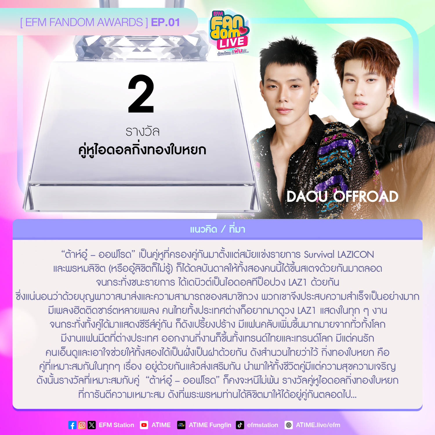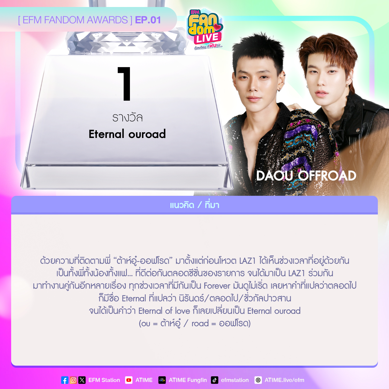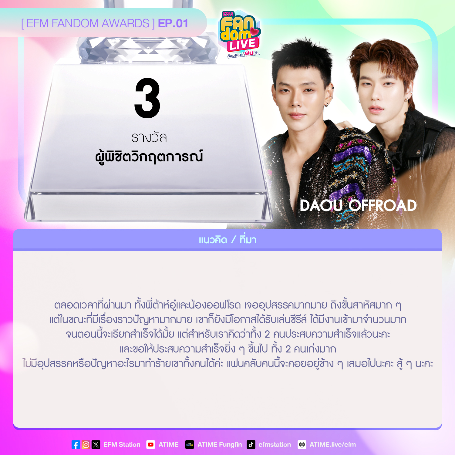ออฟโรด : ขอบคุณแฟนคลับ เราเห็นทุกความตั้งใจเลย ไม่ว่าจะเป็นรางวัลอะไรก็จะช่วยโหวตเอามาให้ลูกได้ และก็ขอบคุณรายการ EFM FANDOM LIVE ด้วยครับที่เชิญเรามาตลอด ขอบคุณแฟนคลับที่เห็นถึงความสำคัญของพวกเรามาตลอด ขอบคุณ Partner ของผม ที่ซัพพอร์ตตั้งแต่วันนั้น มาจนถึงวันนี้