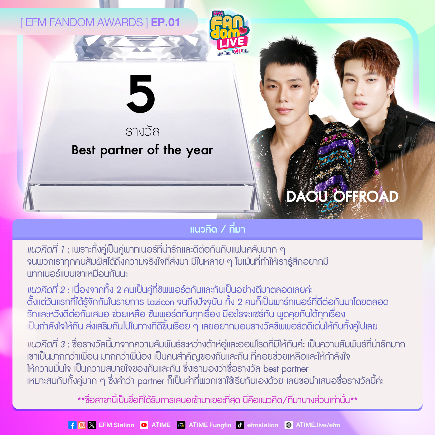 แนวคิด 3 : ชื่อรางวัลนี้มาจากความสัมพันธ์ระหว่าง “ต้าห์อู๋ – ออฟโรด” ที่มีให้กันเป็นความสัมพันธ์ที่น่ารักมาก เขาเป็นมากกว่าเพื่อน มากกว่าพี่น้อง เป็นคนสำคัญของกันและกัน ที่คอยช่วยเหลือและให้กำลังใจ ให้ความมั่นใจ เป็นความสบายใจของกันและกัน ซึ่งเรามองว่าชื่อรางวัล best partner เหมาะสมกับทั้งคู่มากๆ ซึ่งคำว่า partner ก็เป็นคำที่พวกเขาใช้เรียกันเองด้วย เลยขอนำเสนอชื่อรางวัลนี้