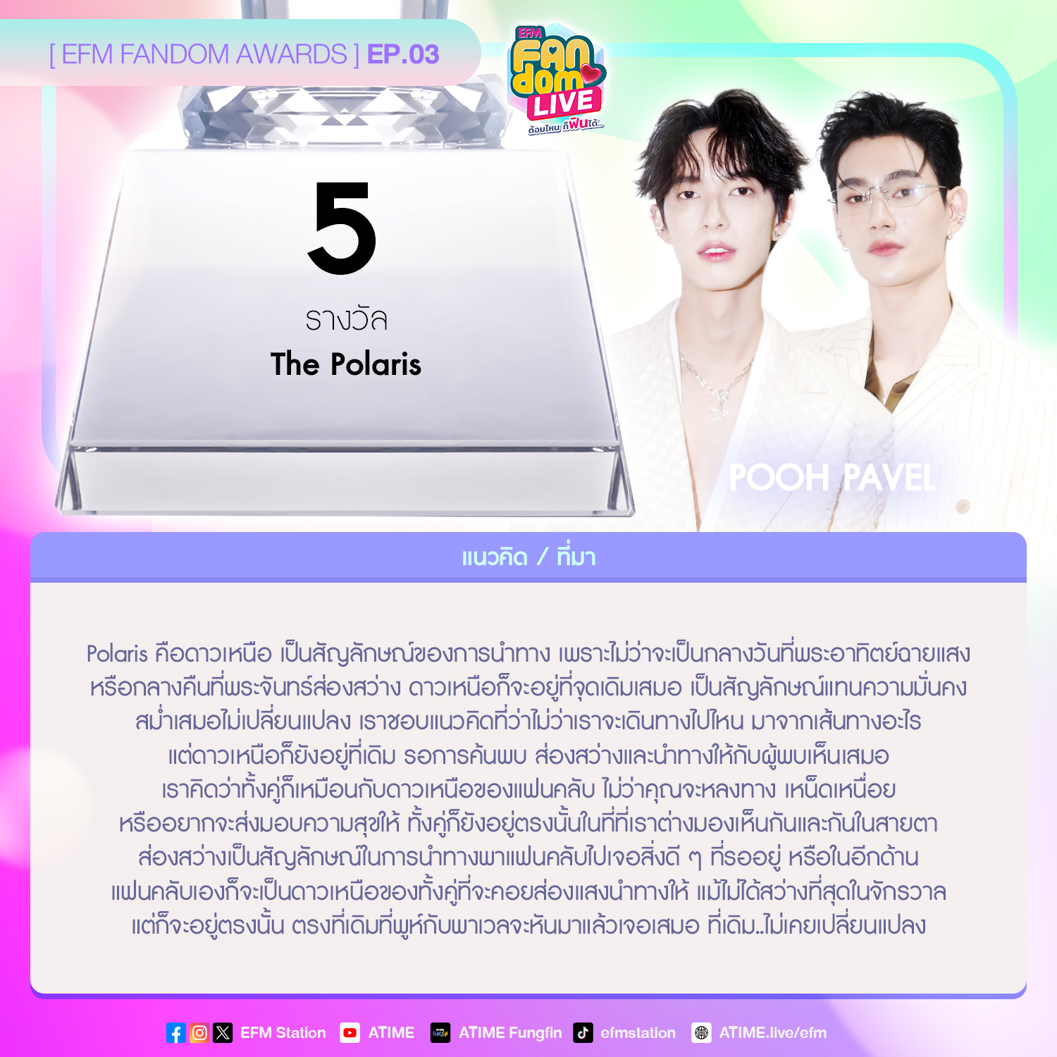Polaris คือดาวเหนือ เป็นสัญลักษณ์ของการนำทาง เพราะไม่ว่าจะเป็นกลางวันที่พระอาทิตย์ฉายแสง หรือ กลางคืนที่พระจันทร์ส่องสว่าง ดาวเหนือก็จะอยู่ที่จุดเดิมเสมอ เป็นสัญลักษณ์แทนความมั่นคง สม่ำเสมอไม่เปลี่ยนแปลง เราชอบแนวคิดที่ว่าไม่ว่าเราจะเดินทางไปไหน มาจากเส้นทางอะไร แต่ดาวเหนือก็ยังอยู่ที่เดิมรอการค้นพบ ส่องสว่างและนำทางให้กับผู้พบเห็นเสมอ เราคิดว่าทั้งคู่ก็เหมือนกับดาวเหนือของแฟนคลับ ไม่ว่าคุณจะหลงทาง เหน็ดเหนื่อย หรืออยากจะส่งมอบความสุขให้ ทั้งคู่ก็ยังอยู่ตรงนั้นในที่ที่เราต่างมองเห็นกันและกันในสายตา ส่องสว่างเป็นสัญลักษณ์ในการนำทางพาแฟนคลับไปเจอสิ่งดี ๆ ที่รออยู่ หรือในอีกด้าน แฟนคลับเองก็จะเป็นดาวเหนือของทั้งคู่ที่จะคอยส่องแสงนำทางให้ แม้ไม่ได้สว่างที่สุดในจักรวาล แต่ก็จะอยู่ตรงนั้น ตรงที่เดิมที่พูห์กับพาเวลจะหันมาแล้วเจอเสมอ ที่เดิม..ไม่เคยเปลี่ยนแปลง
