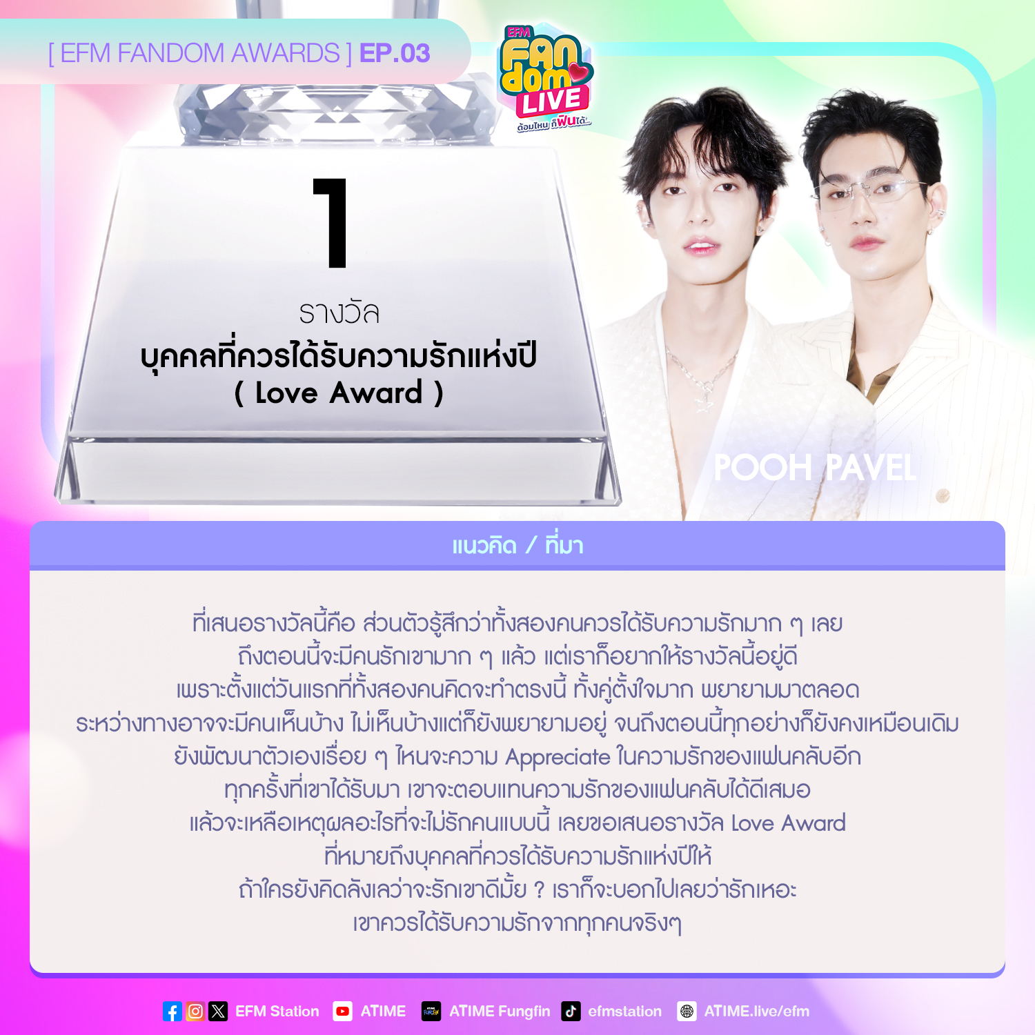 ที่เสนอรางวัลนี้ ส่วนตัวรู้สึกว่าทั้งสองคนควรได้รับความรักมาก ๆ เลย ถึงตอนนี้จะมีคนรักเขามาก ๆ แล้ว แต่เราก็อยากให้รางวัลนี้อยู่ดี เพราะตั้งแต่วันแรกที่ทั้งสองคนคิดจะทำตรงนี้ ทั้งคู่ตั้งใจมาก พยายามมาตลอด ระหว่างทางอาจจะมีคนเห็นบ้าง ไม่เห็นบ้างแต่ก็ยังพยายามอยู่ จนถึงตอนนี้ทุกอย่างก็ยังคงเหมือนเดิม ยังพัฒนาตัวเองเรื่อย ๆ ไหนจะความAppreciate ในความรักของแฟนคลับอีก ทุกครั้งที่เขาได้รับมา เขาจะตอบแทนความรักของแฟนคลับได้ดีเสมอ แล้วจะเหลือเหตุผลอะไรที่จะไม่รักคนแบบนี้ เลยขอเสนอรางวัล Love Award ที่หมายถึงบุคคลที่ควรได้รับความรักแห่งปีให้ ถ้าใครยังคิดลังเลว่าจะรักเขาดีมั้ย? เราก็จะบอกไปเลยว่ารักเหอะ เขาควรได้รับความรักจากทุกคนจริง ๆ