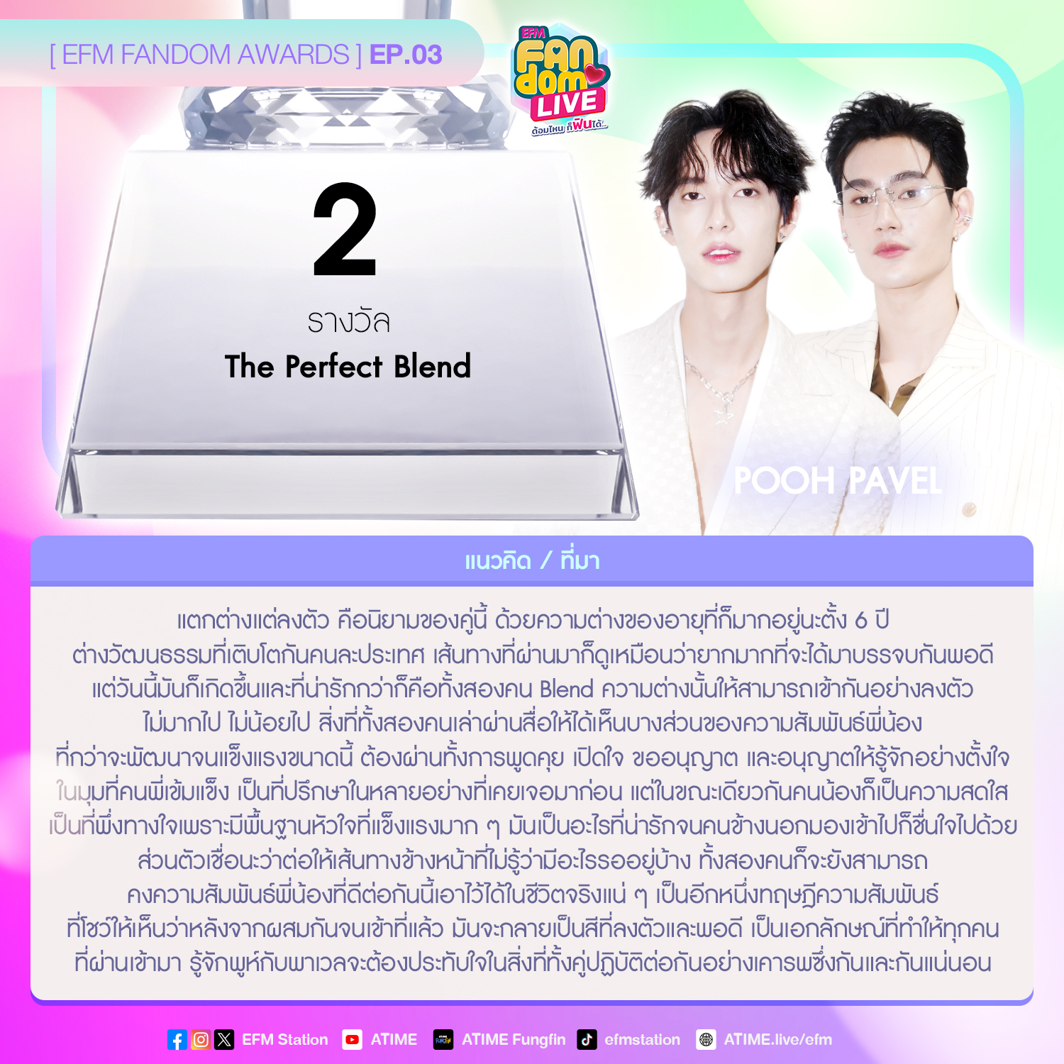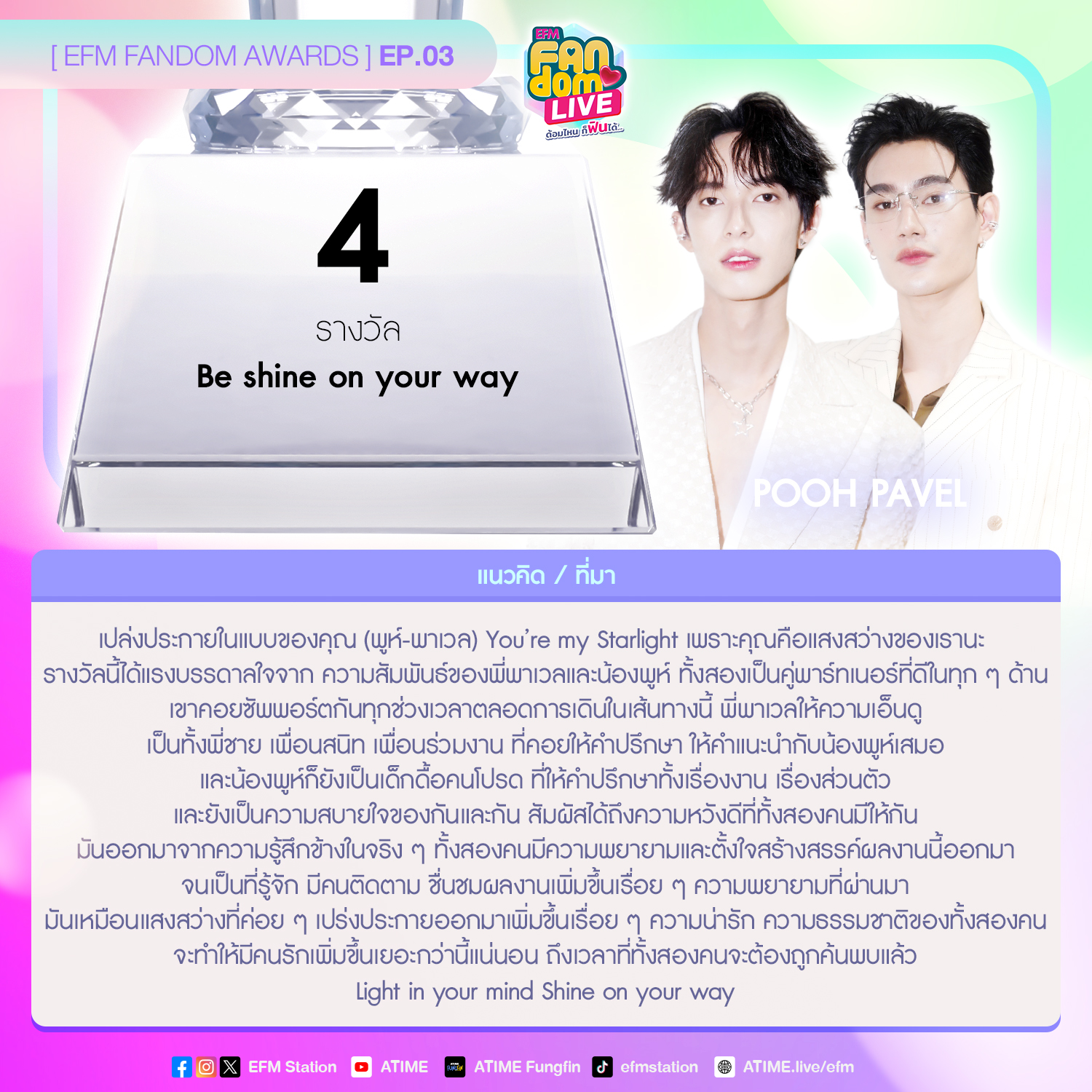 รางวัลนี้ได้แรงบรรดาลใจจาก ความสัมพันธ์ของพี่พาเวลและน้องพูห์ ทั้งสองเป็นคู่พาร์ทเนอร์ที่ดีในทุก ๆ ด้าน เขาคอยซัพพอร์ตกันทุกช่วงเวลาตลอดการเดินในเส้นทางนี้ พี่พาเวลให้ความเอ็นดู เป็นทั้งพี่ชาย เพื่อนสนิท เพื่อนร่วมงาน ที่คอยให้คำปรึกษา ให้คำแนะนำกับน้องพูห์เสมอ และน้องพูห์ก็ยังเป็นเด็กดื้อคนโปรด ที่ให้คำปรึกษาทั้งเรื่องงาน เรื่องส่วนตัว และยังเป็นความสบายใจของกันและกัน สัมผัสได้ถึงความหวังดีที่ทั้งสองคนมีให้กันมันออกมาจากความรู้สึกข้างในจริง ๆ ทั้งสองคนมีความพยายามและตั้งใจสร้างสรรค์ผลงานนี้ออกมา จนเป็นที่รู้จัก มีคนติดตาม ชื่นชมผลงานเพิ่มขึ้นเรื่อยๆ ความพยายามที่ผ่านมามันเหมือนแสงสว่างที่ค่อย ๆ เปร่งประกายออกมาเพิ่มขึ้นเรื่อย ๆ ความน่ารัก ความธรรมชาติของทั้งสองคน จะทำให้มีคนรักเพิ่มขึ้นเยอะกว่านี้แน่นอน ถึงเวลาที่ทั้งสองคนจะต้องถูกค้นพบแล้ว Light in your mind Shine on your way