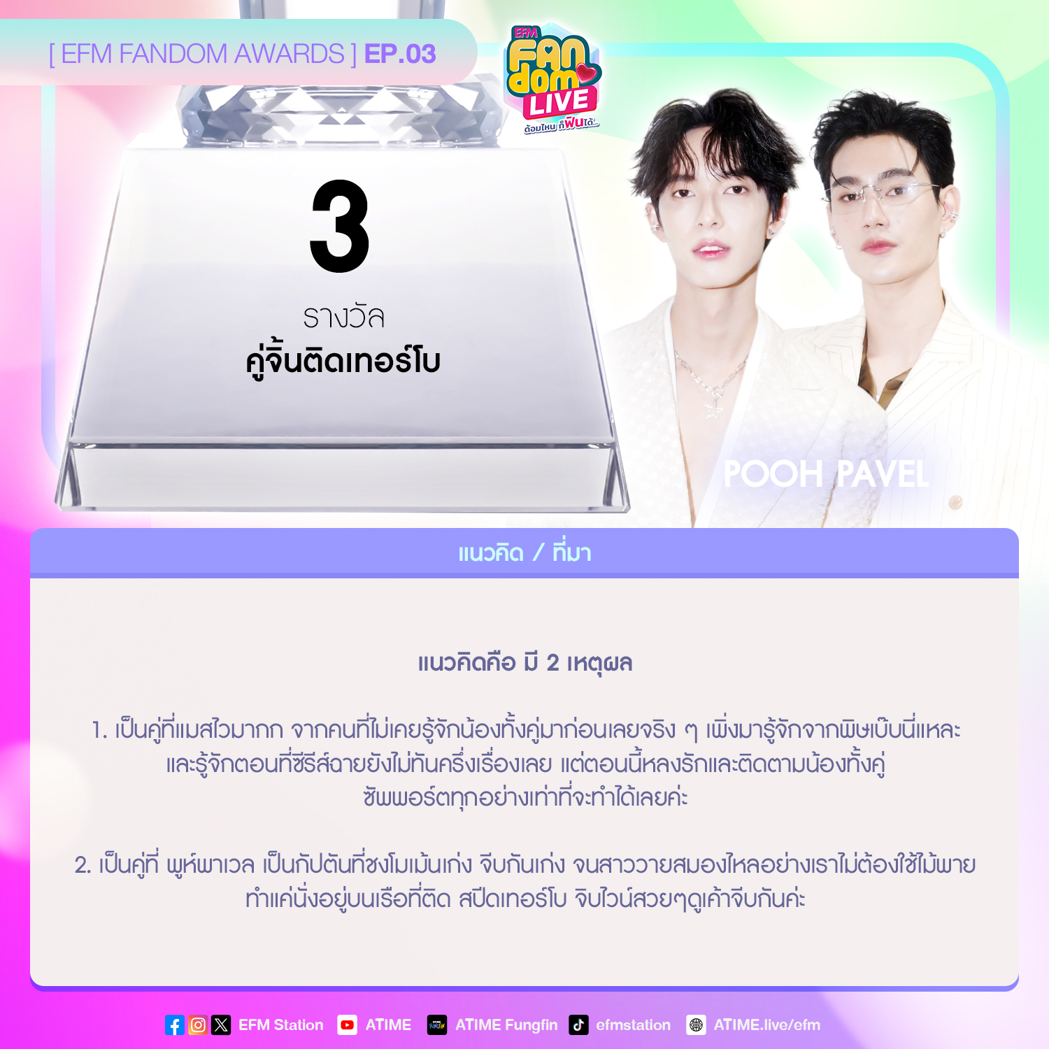 สุดท้ายนี้ EFM FANDOM LIVE ขอขอบคุณ “พูห์-พาเวล” ที่มาร่วมพูดคุย สร้างความสุข ความน่ารักให้ #เด็กเบ๊บทุกคน และเหล่าแฟนๆรายการ ฝากติดตามซีรีส์ “PIT BABE The Series” ทุกวันศุกร์ เวลา 21:15 น. ทางช่องวัน 31 ฝากเพลง “BETTER ME” ซึ่งเป็นเพลงคู่ระหว่าง “พูห์ – พาเวล” และ “แข็งแรงไม่พอ” เพลงจาก “พาเวล” กันด้วยน้าาา