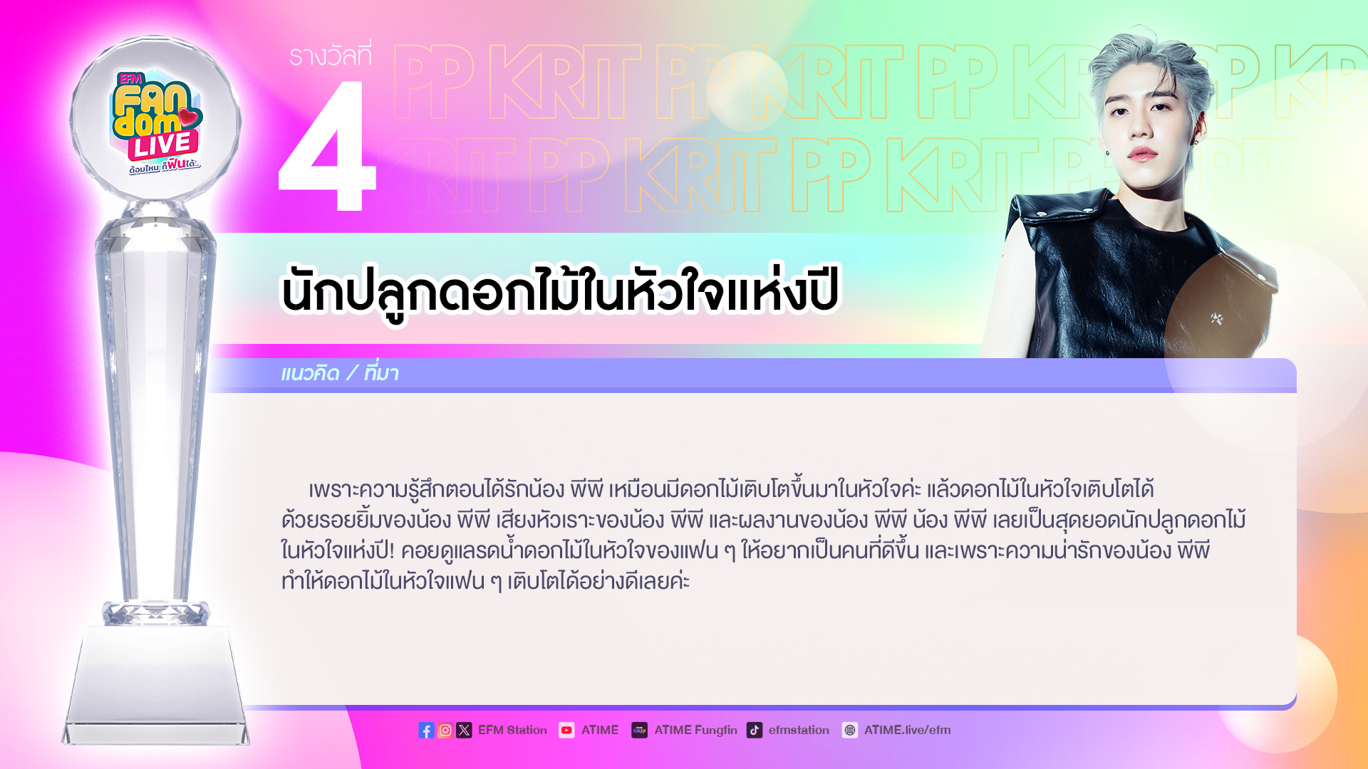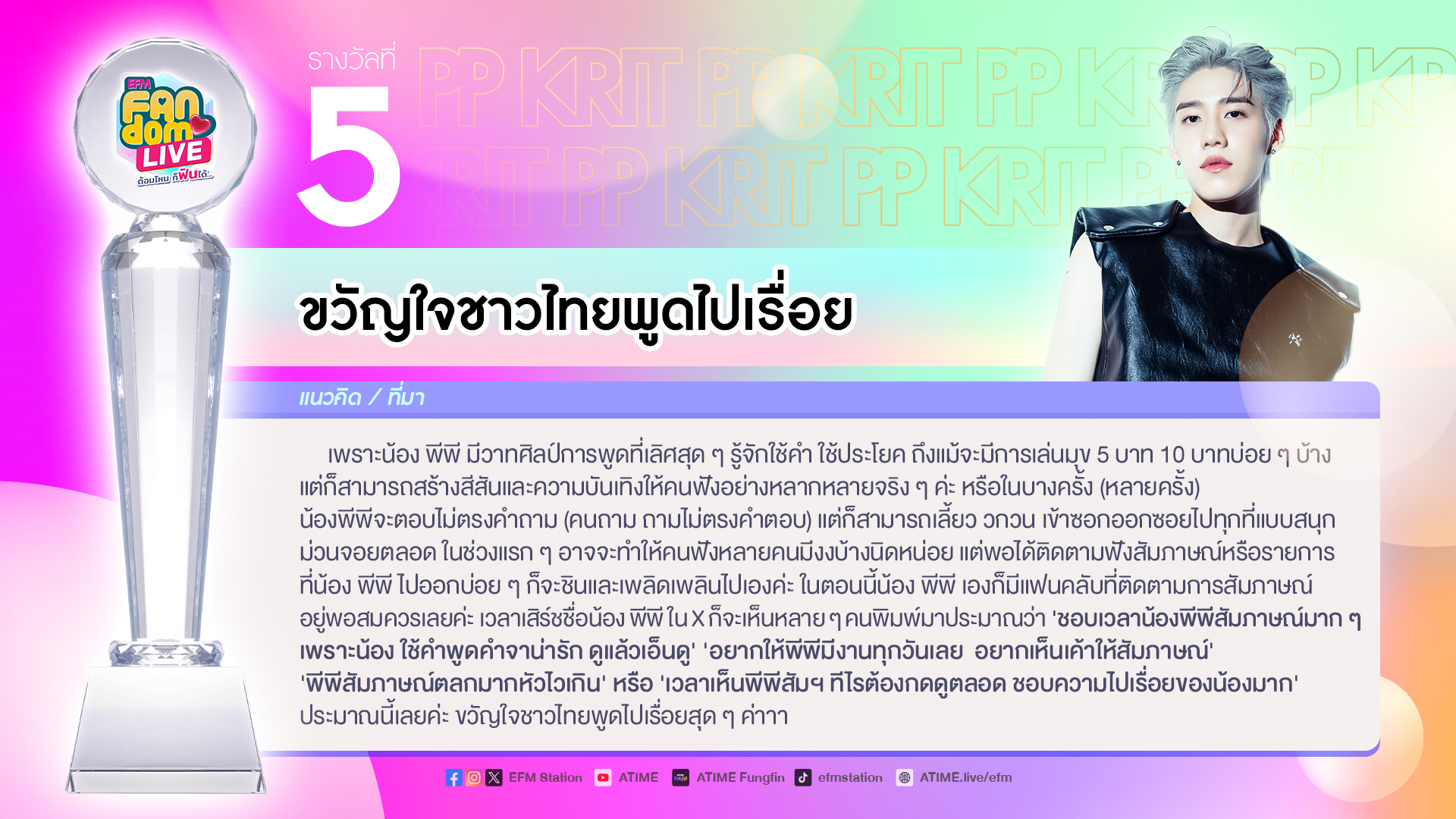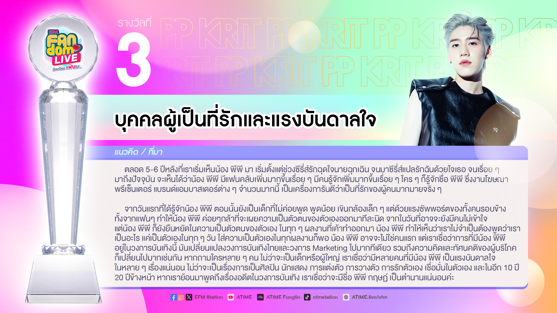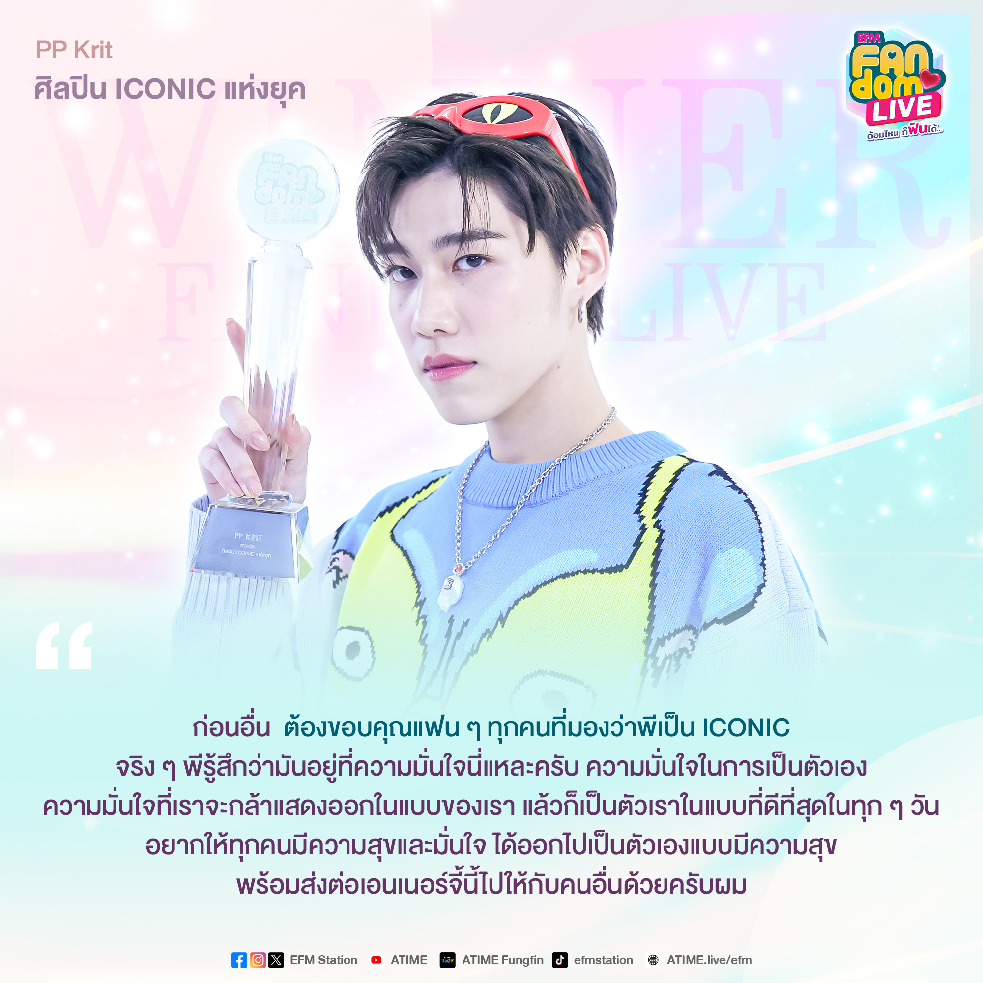 สุดท้ายนี้ EFM FANDOM LIVE ขอขอบคุณ “PP Krit” ที่มาร่วมพูดคุย สร้างความน่ารัก ความสุขให้กับรายการ และก่อนจะจบรายการกันไป ฝากติดตามเพลง “เสนอตัว (Ooh!)” สามารถรับชมได้ทาง YouTube : PP Krit Entertainment หรือสตรีมมิ่งทุกแพลตฟอร์ม ไปติดตามกันได้เลย