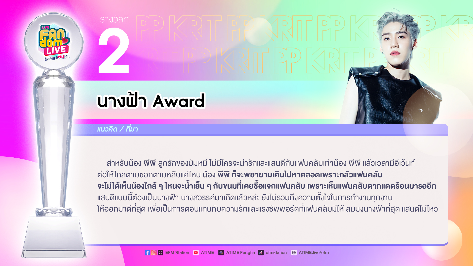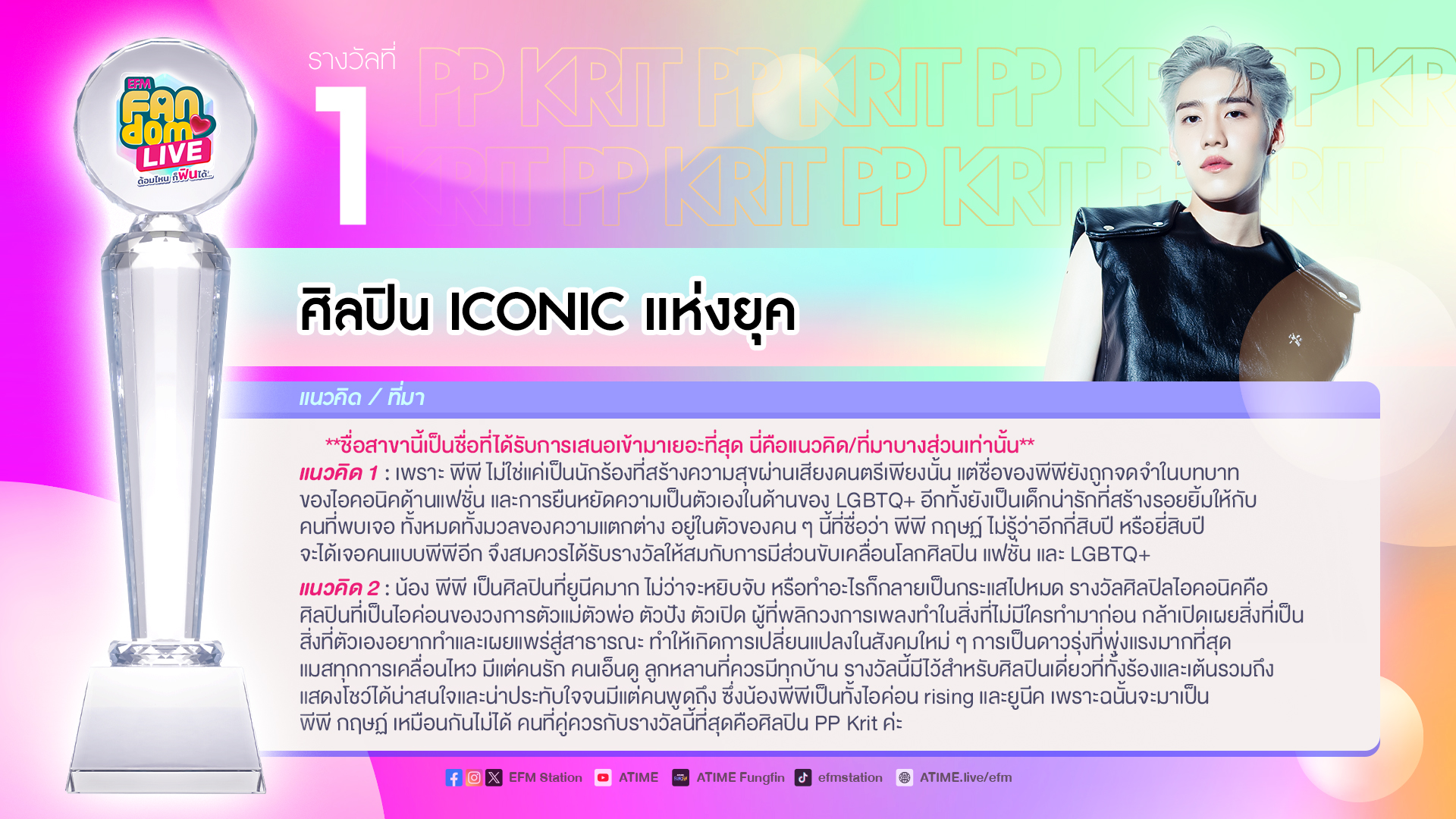 แนวคิด 2 : น้อง พีพี เป็นศิลปินที่ยูนีคมาก ไม่ว่าจะหยิบจับ หรือทำอะไรก็กลายเป็นกระแสไปหมดรางวัลศิลปิลไอคอนิคคือศิลปินที่เป็นไอค่อนของวงการตัวแม่ตัวพ่อ ตัวปัง ตัวเปิด ผู้ที่พลิกวงการเพลงทำในสิ่งที่ไม่มีใครทำมาก่อน กล้าเปิดเผยสิ่งที่เป็น สิ่งที่ตัวเองอยากทำและเผยแพร่สู่สาธารณะ ทำให้เกิดการเปลี่ยนแปลงในสังคมใหม่ๆ การเป็นดาวรุ่งที่พุ่งแรงมากที่สุด แมสทุกการเคลื่อนไหว มีแต่คนรัก คนเอ็นดู ลูกหลานที่ควรมีทุกบ้าน รางวัลนี้มีไว้สำหรับศิลปินเดี่ยวที่ทั้งร้องและเต้นรวมถึงแสดงโชว์ได้น่าสนใจและน่าประทับใจจนมีแต่คนพูดถึง ซึ่งน้องพีพีเป็นทั้งไอค่อน rising และยูนีค เพราะฉนั้นจะมาเป็น พีพี กฤษฏ์ เหมือนกันไม่ได้ คนที่คู่ควรกับรางวัลนี้ที่สุดคือศิลปิน PP Krit ค่ะ