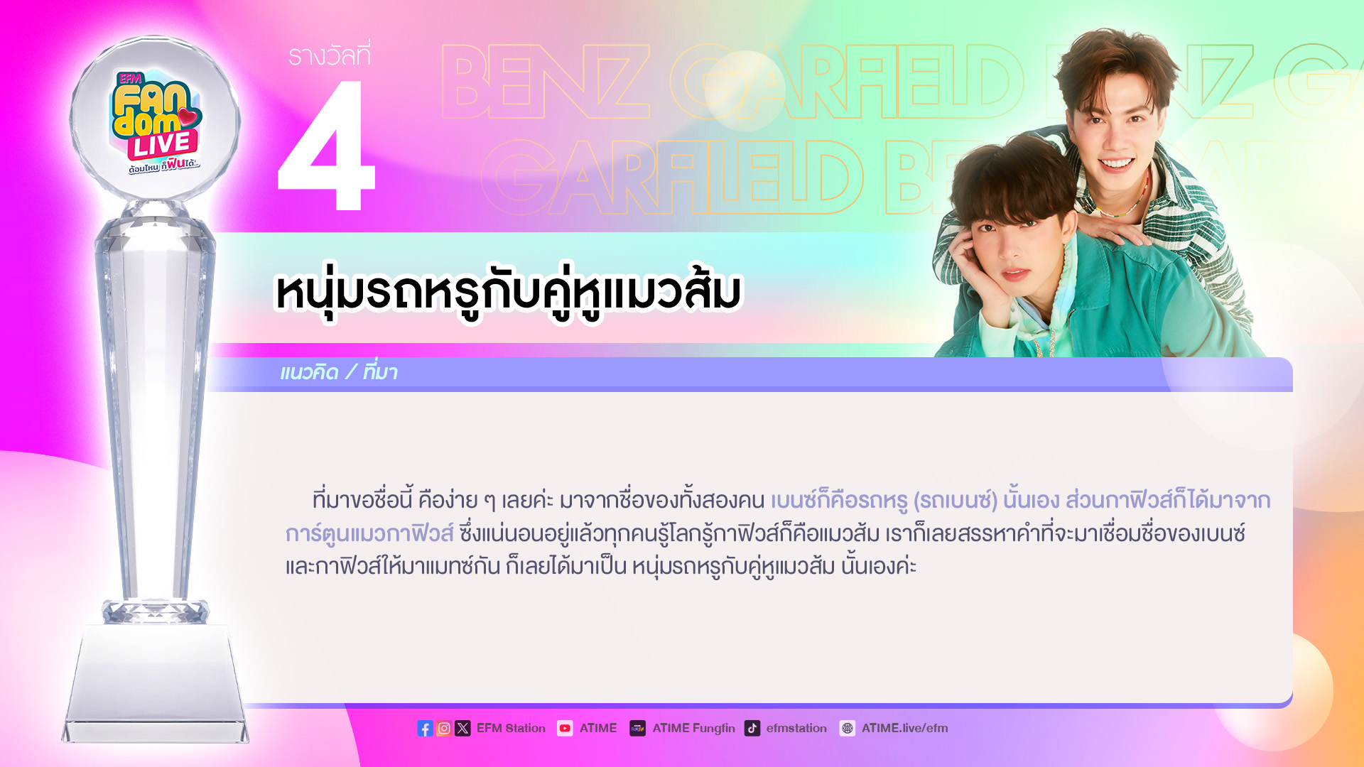 สุดท้ายนี้ EFM FANDOM LIVE ขอขอบคุณ “เบนซ์ - กาฟิวส์” ที่มาร่วมพูดคุย สร้างเสียงหัวเราะ ความสุขให้กับรายการ และก่อนจะจบรายการกันไป ฝากติดตามซีรีย์ “รักนี้ไม่มีถั่งฟักยาว” และกิจกรรม “กะเพราCHALLENGE” สามารถติดตามข้อมูลได้ทาง CHANGE2561 ไปติดตามกันได้เลย