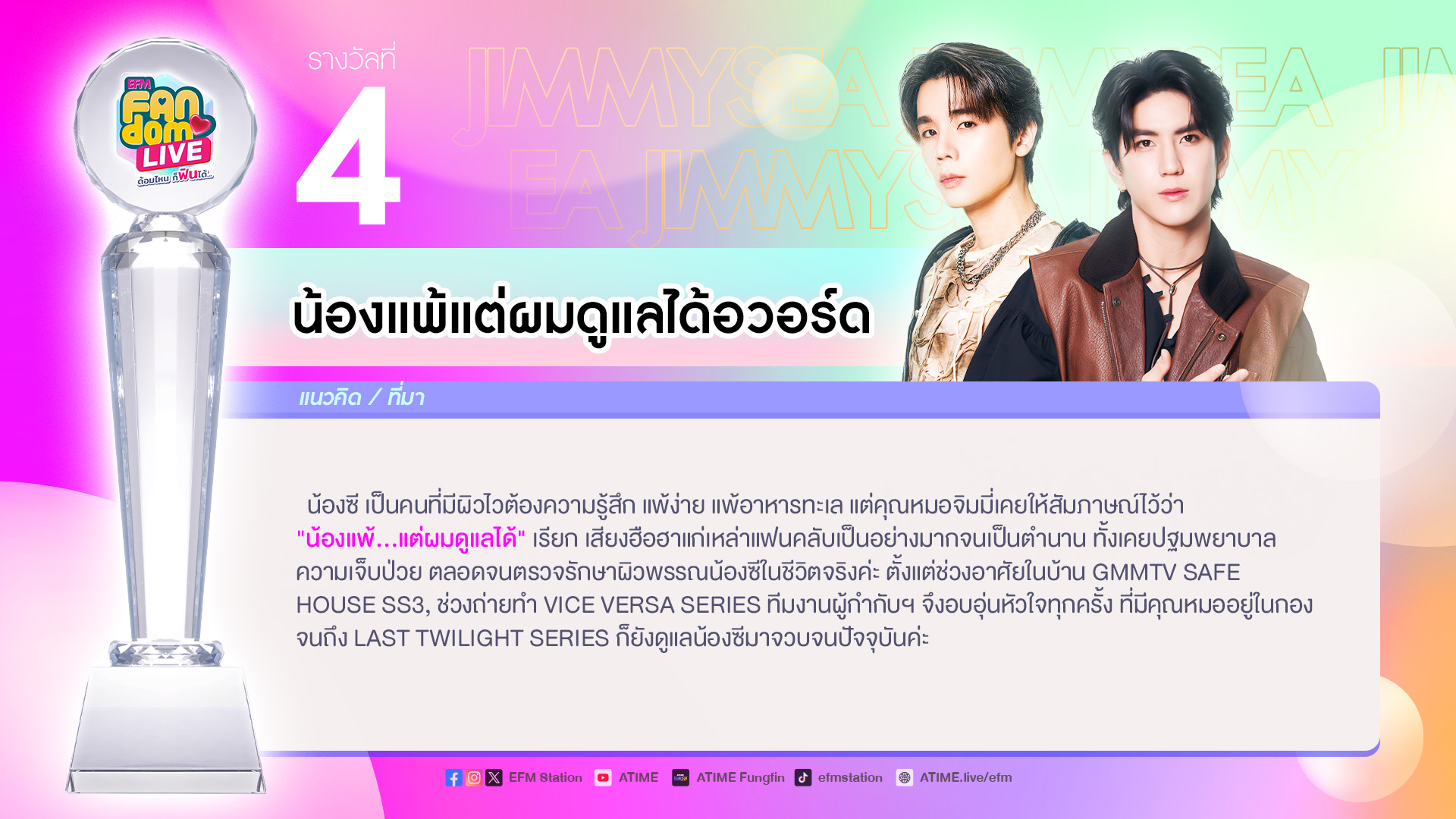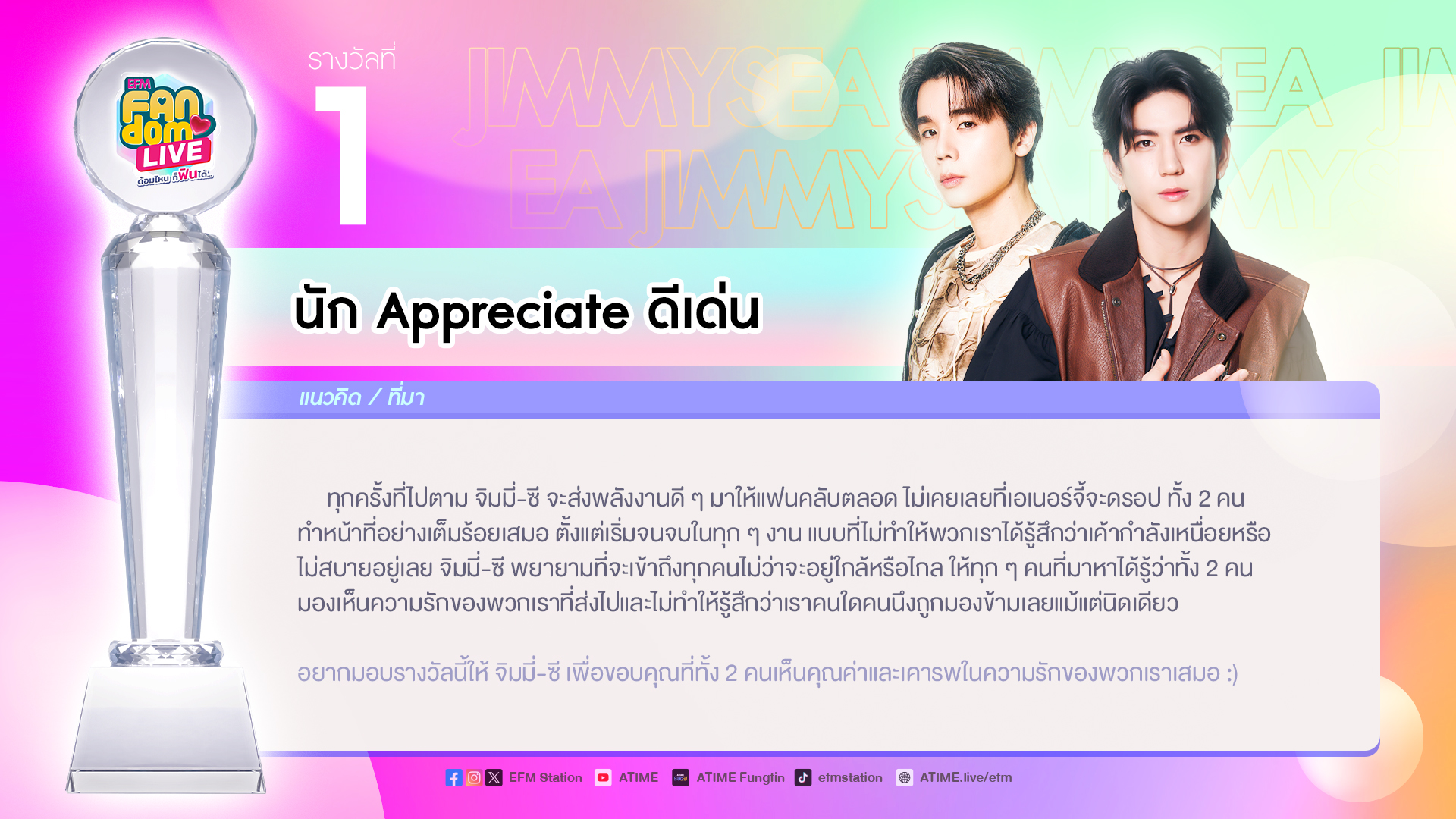 ทุกครั้งที่ไปตาม จิมมี่-ซี จะส่งพลังงานดีๆ มาให้แฟนคลับตลอด ไม่เคยเลยที่เอเนอร์จี้จะดรอป ทั้ง 2 คนทำหน้าที่อย่างเต็มร้อยเสมอ ตั้งแต่เริ่มจนจบในทุกๆ งาน แบบที่ไม่ทำให้พวกเราได้รู้สึกว่าเค้ากำลังเหนื่อยหรือไม่สบายอยู่เลย จิมมี่-ซี พยายามที่จะเข้าถึงทุกคนไม่ว่าจะอยู่ใกล้หรือไกล ให้ทุกๆ คนที่มาหาได้รู้ว่าทั้ง 2 คนมองเห็นความรักของพวกเราที่ส่งไป และไม่ทำให้รู้สึกว่าเราคนใดคนนึงถูกมองข้ามเลยแม้แต่นิดเดียว อยากมอบรางวัลนี้ให้ จิมมี่-ซี เพื่อขอบคุณที่ทั้ง 2 คนเห็นคุณค่าและเคารพในความรักของพวกเราเสมอ :)