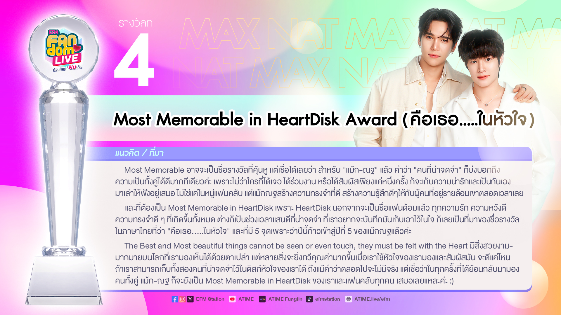 แต่เชื่อว่าในทุกครั้งที่ได้ย้อนกลับมามองคนทั้งคู่ แม้ก-ณฐ ก็จะยังเป็น Most Memorable in HeartDisk ของเรา และแฟนคลับทุกคน เสมอเลยแหละค่ะ :)