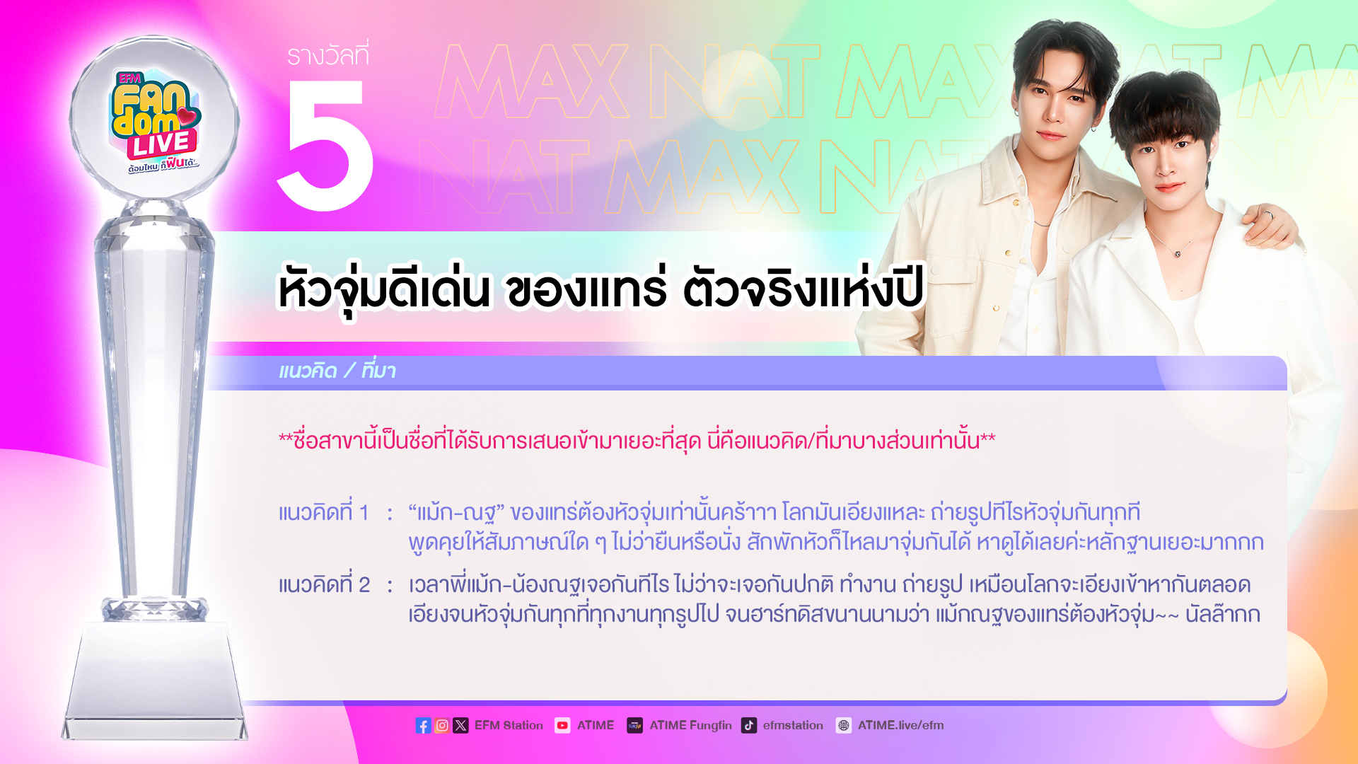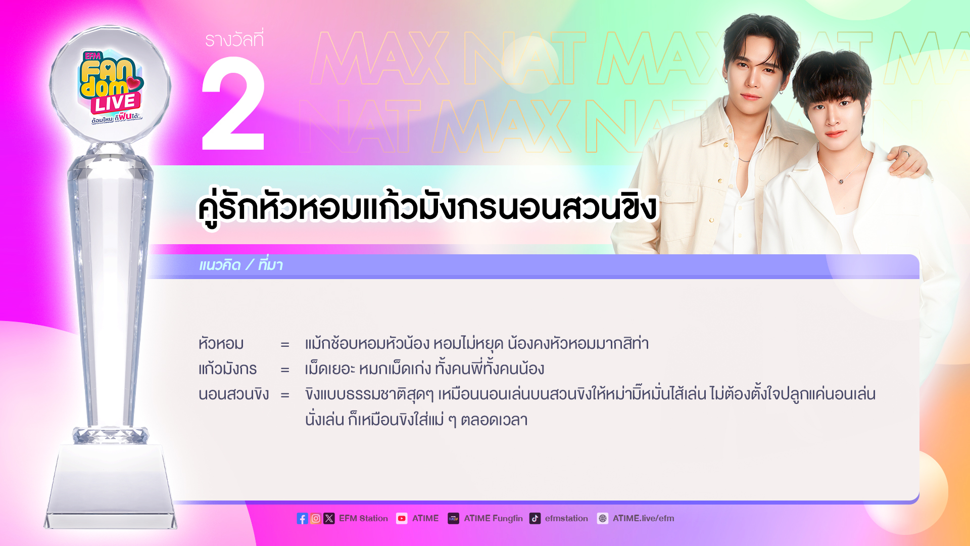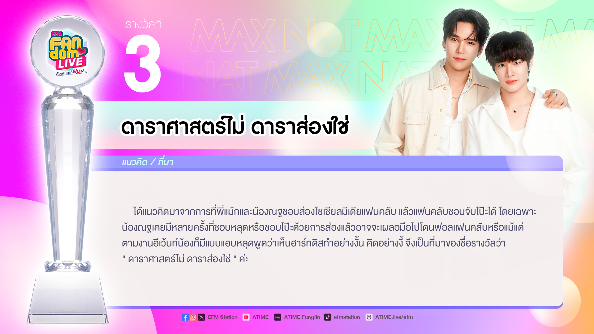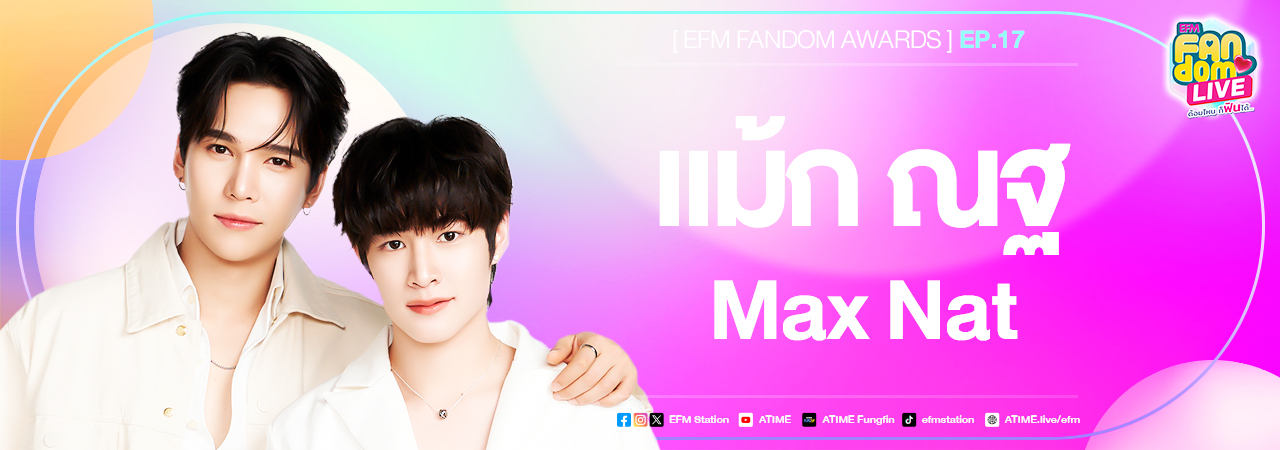 สุดท้ายนี้ EFM FANDOM LIVE ขอขอบคุณ “แม้ก - ณฐ” ที่มาร่วมพูดคุย สร้างความสุข มอบเสียงหัวเราะ และรอยยิ้มน่ารัก ๆ ให้กับรายการ และก่อนจะจบรายการกันไป ฝากซีรีส์เรื่องล่าสุดกับ “2 Worlds โลกสองใบ ใจดวงเดียว” สามารถรับชมผ่านทาง IQIYI ทุกวันพุธพฤหัสบดี เวลา 20:00 และรวมถึงงานไฟนอลอีพีในวันที่ 16 พฤษภาคมนี้ ! แฟน ๆ สามารถซื้อบัตรได้ที่ Ticketmelon และสามารถติดตามความเคลื่อนไหวของทั้งคู่ได้ทุกแพลตฟอร์มทั้ง Instagram / TikTok / X : MMAXMAX / NAT.NATASIT ไปติดตามกันได้เลย