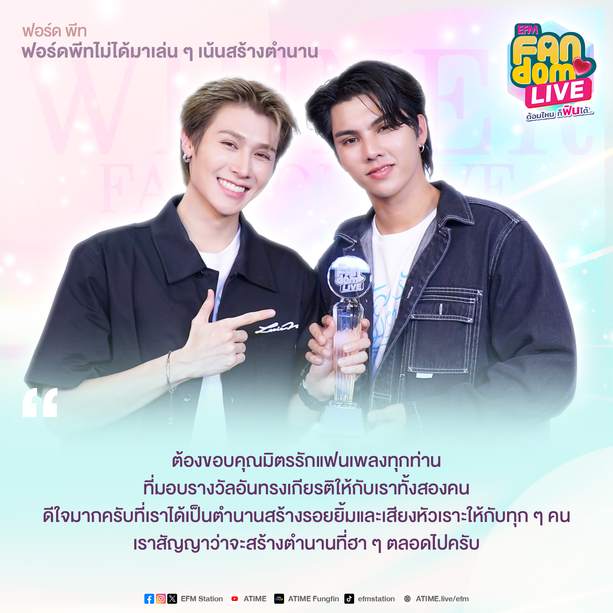 สุดท้ายนี้ EFM FANDOM LIVE ขอขอบคุณ “ฟอร์ด-พีท” ที่มาร่วมพูดคุย สร้างความน่ารัก ความสุขให้กับรายการ และก่อนจะจบรายการกันไป ฝากติดตามซีรีส์ “ต้องรักมหาสมุทร Love Sea The Series” สามารถรับชมได้ทาง GMM25 ได้เลยค่า