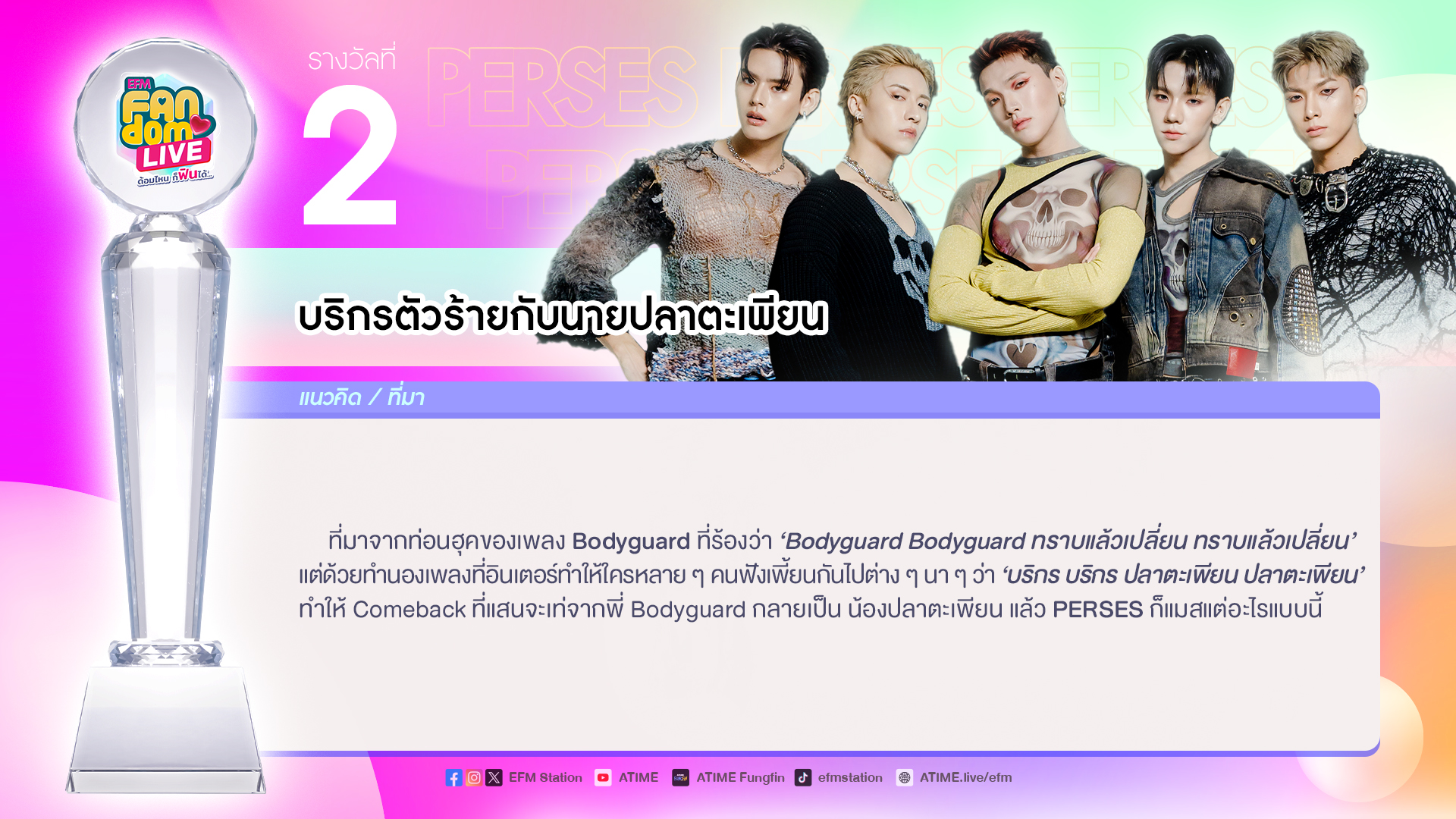 สุดท้ายนี้ EFM FANDOM LIVE ขอขอบคุณ “PERSES” ที่มาร่วมพูดคุย สร้างความน่ารัก ความสุขให้กับรายการ และฝากติดตามซิงเกิลใหม่ล่าสุดเพลง “Bodyguard” สามารถรับชมได้ทาง Youtube : gnest_official ฝาก Dance Challenge ใน TikTok และงาน Featival ช่วงปลายปี แล้วก็ผลงานในอนาคตที่จะปล่อยออกมาให้ได้ชมต่อจากนี้รอติดตามกันได้เลย