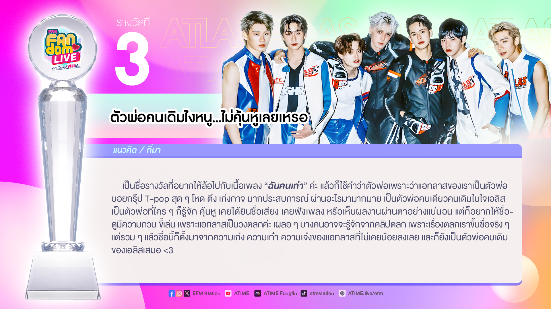 เป็นชื่อรางวัลที่อยากให้ล้อไปกับเนื้อเพลง "ฉันคนเก่า" ค่ะ แล้วก็ใช้คำว่าตัวพ่อเพราะว่าแอทลาสของเราเป็นตัวพ่อบอยกรุ๊ป T-pop สุด ๆ โหด ตึง เก่งกาจ มากประสบการณ์ ผ่านอะไรมามากมาย เป็นตัวพ่อคนเดียวคนเดิมในใจเอลิส เป็นตัวพ่อที่ใคร ๆ ก็รู้จัก คุ้นหู เคยได้ยินชื่อเสียง เคยฟังเพลง หรือเห็นผลงานผ่านตาอย่างแน่นอน แต่ก็อยากให้ชื่อดูมีความกวน ขี้เล่น เพราะแอทลาสเป็นวงตลกค่ะ เผลอ ๆ บางคนอาจจะรู้จักจากคลิปตลก เพราะเรื่องตลกเราขึ้นชื่อจริง แต่รวม ๆ แล้วชื่อนี้ก็ตั้งมาจากความเก่ง ความเก๋า ความเจ๋งของแอทลาสที่ไม่เคยน้อยลงเลย และก็ยังเป็นตัวพ่อคนเดิมของเอลิสเสมอ <3