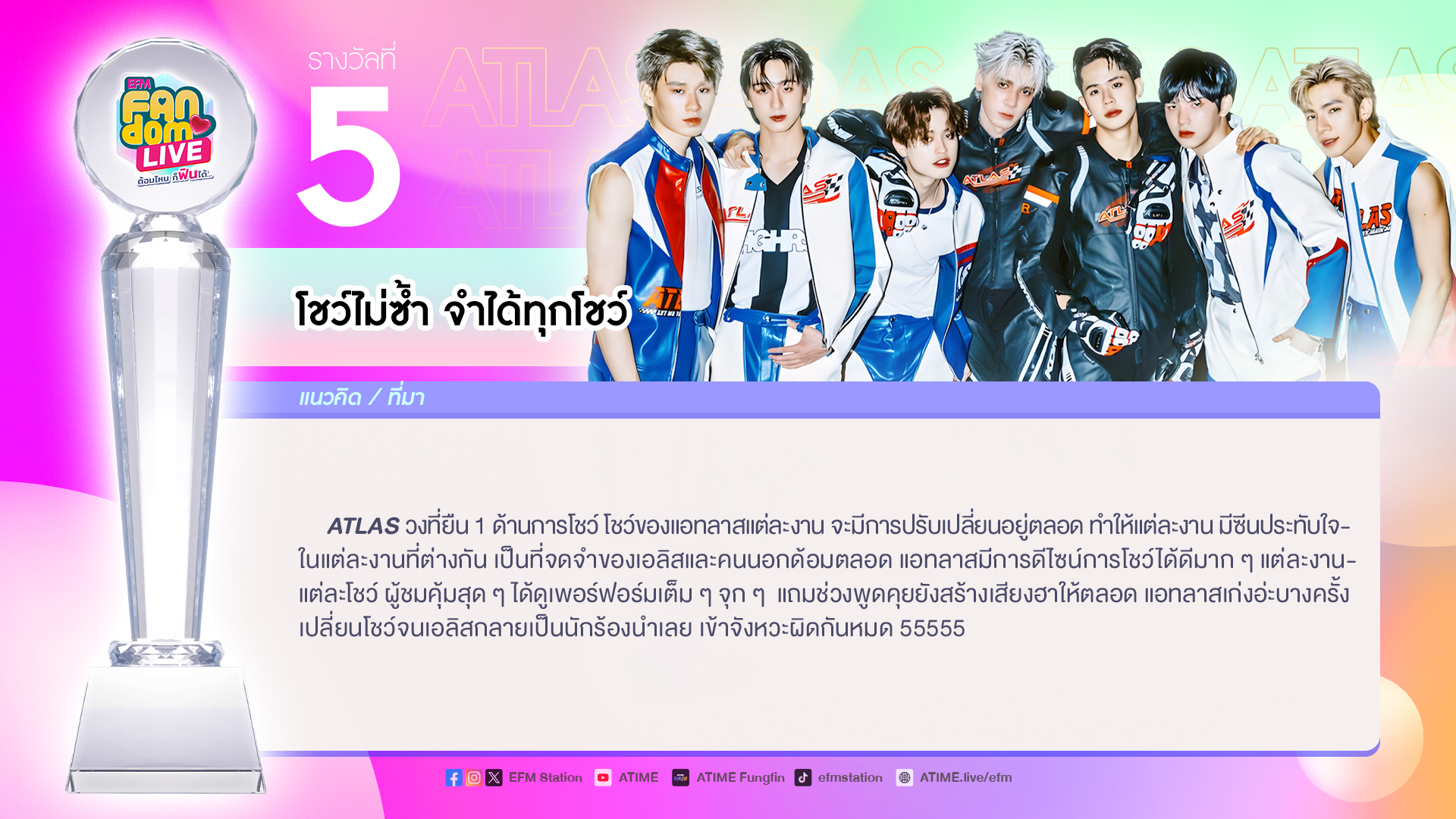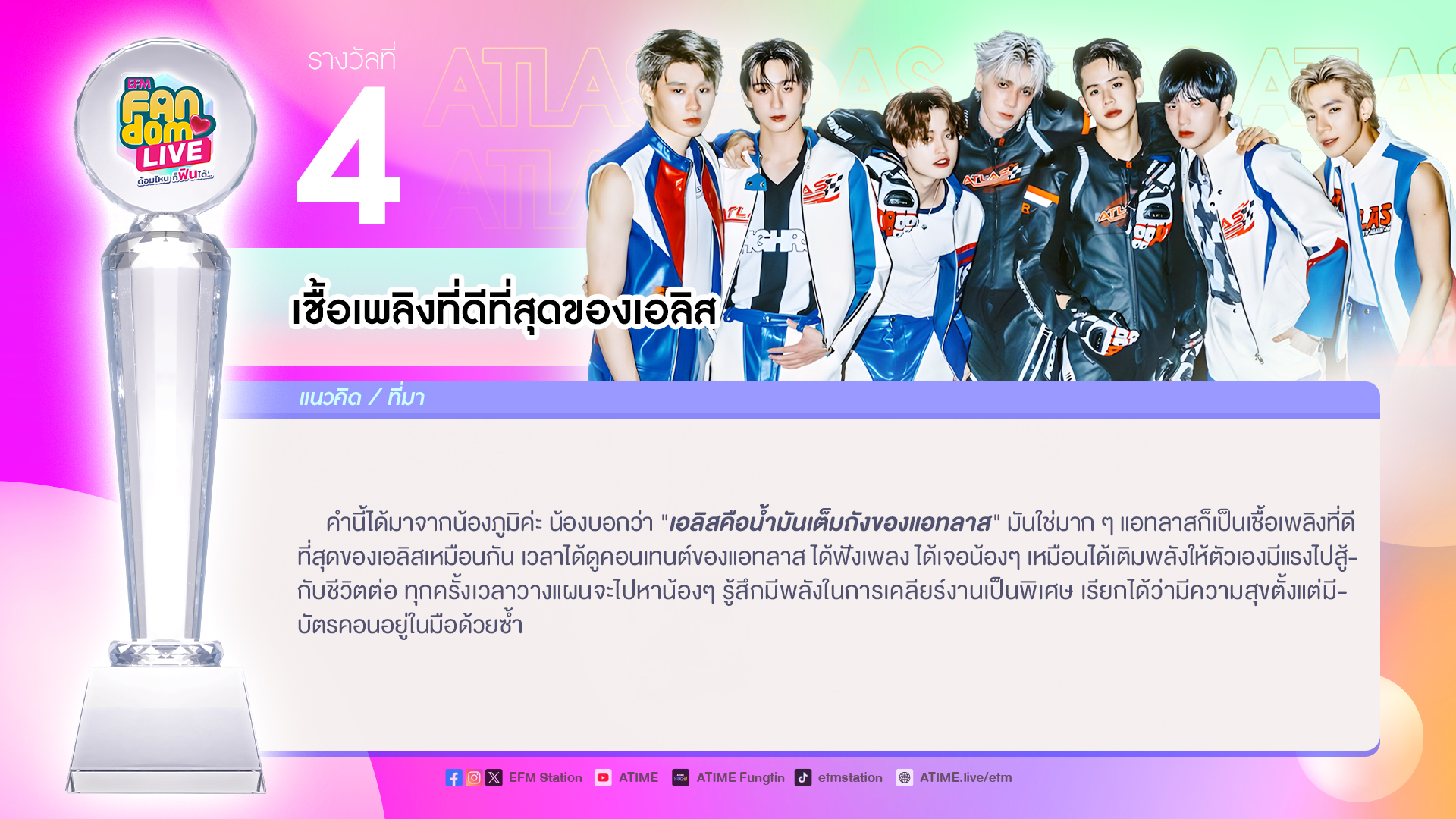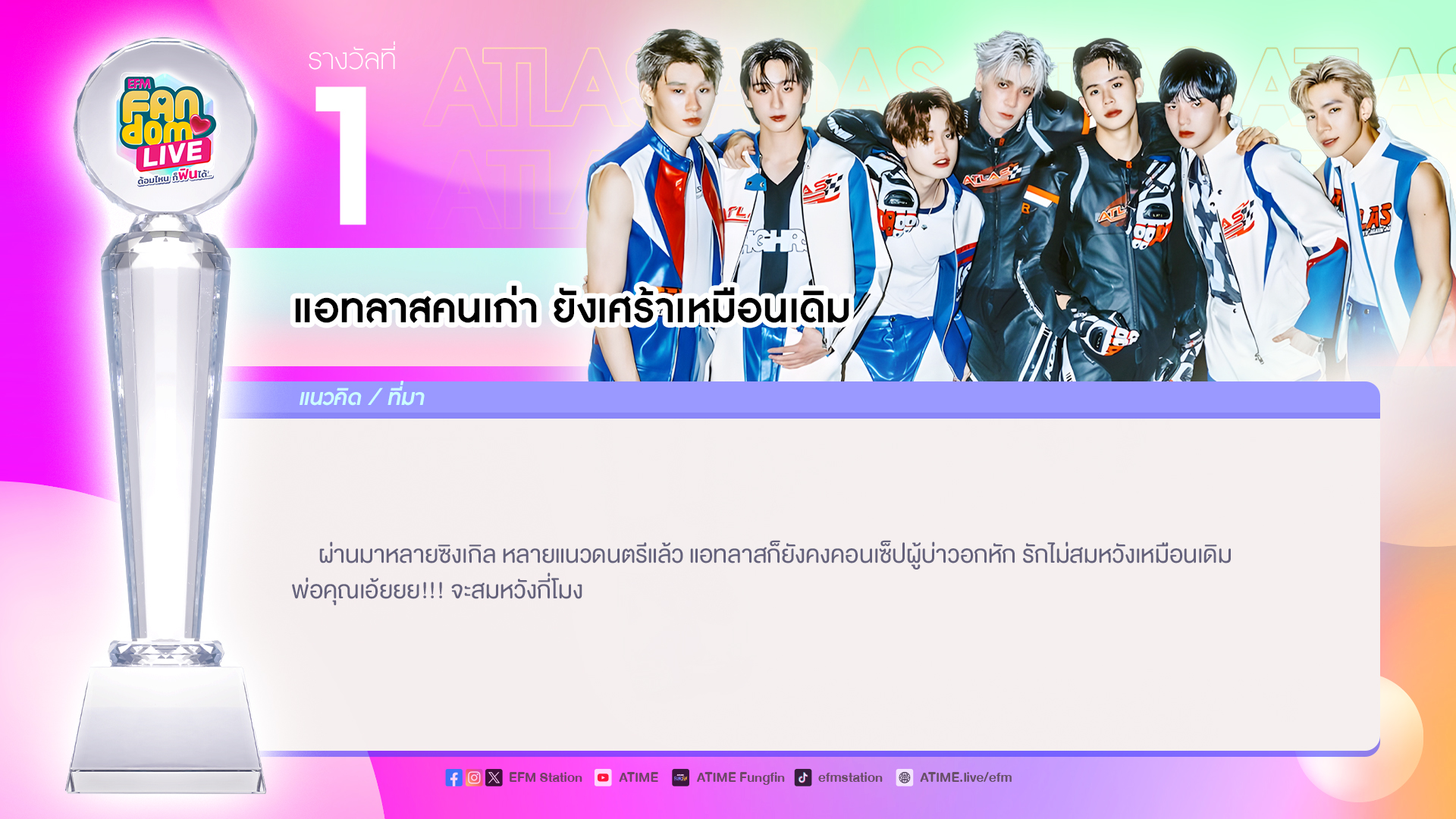 สุดท้ายนี้ EFM FANDOM LIVE ขอขอบคุณ “ATLAS” ที่มาร่วมพูดคุย สร้างรอยยิ้มและเสียงหัวเราะให้แฟนๆกันก่อนเข้านอน ฝากซิงเกิลใหม่ล่าสุด “ฉันคนเก่า ( Let Me Try Again )” สามารถรับชมได้ทาง Youtube : ATLAS และฝากผลงานในอนาคตที่จะปล่อยออกมาให้ได้ชมติดตามได้ทาง Atlas_official_th รอติดตามกันได้เลยน้า