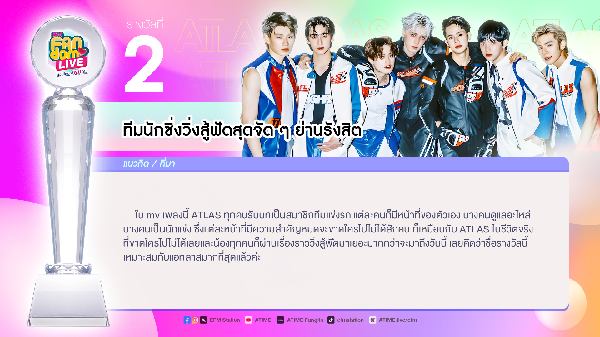 ใน mv เพลงนี้ ATLAS ทุกคนรับบทเป็นสมาชิกทีมแข่งรถ แต่ละคนก็มีหน้าที่ของตัวเอง บางคนดูแลอะไหล่ บางคนเป็นนักแข่ง ซึ่งแต่ละหน้าที่มีความสำคัญหมดจะขาดใครไปไม่ได้สักคน ก็เหมือนกับ ATLAS ในชีวิตจริง ที่ขาดใครไปไม่ได้เลยและน้องทุกคนก็ผ่านเรื่องราววิ่งสู้ฟัดมาเยอะมากกว่าจะมาถึงวันนี้ เลยคิดว่าชื่อรางวัลนี้ เหมาะสมกับแอทลาสมากที่สุดแล้วค่ะ