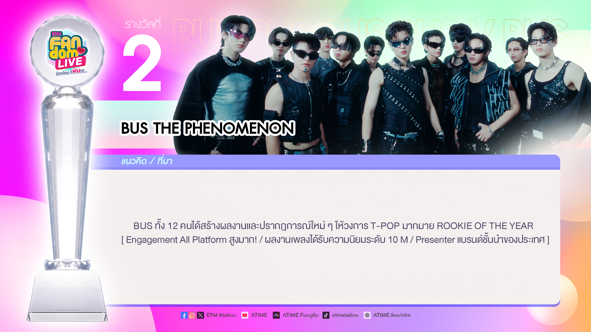 BUS ทั้ง 12 คนได้สร้างผลงานและปรากฎการณ์ใหม่ๆให้วงการ T-POP มากมาย ROOKIE OF THE YEAR [ Engagement All Platform สูงมาก! / ผลงานเพลงได้รับความนิยมระดับ 10 M / Presenter แบรนด์ชั้นนำของประเทศ ]