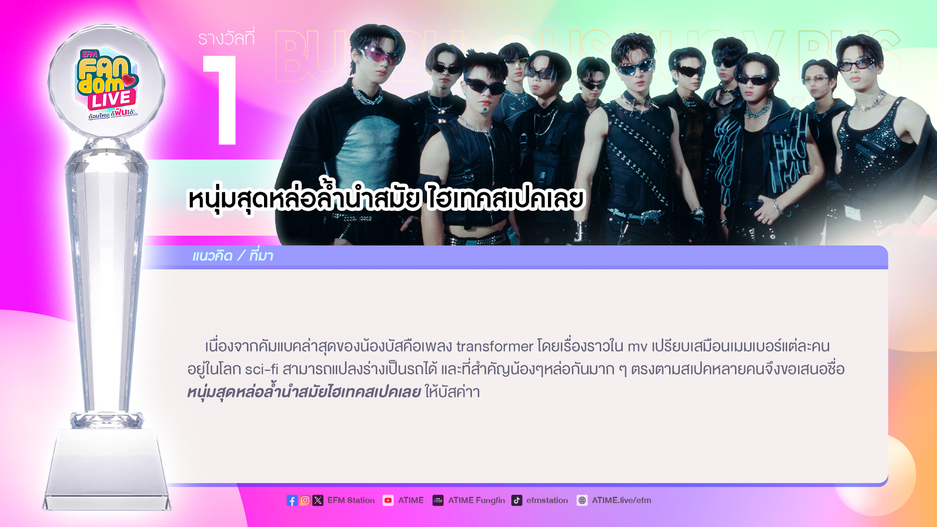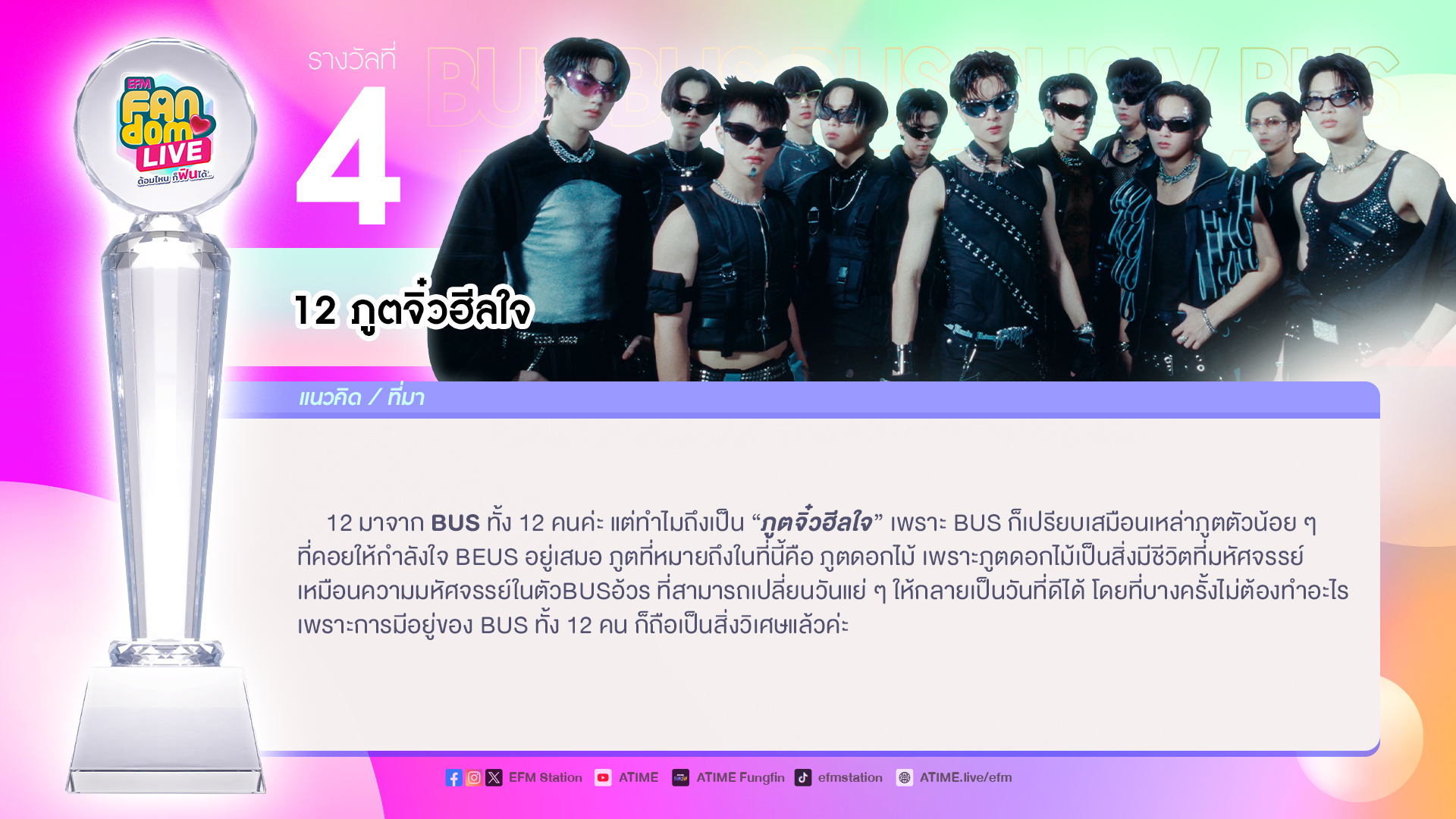 สุดท้ายนี้ EFM FANDOM LIVE ขอขอบคุณ “BUS because of you i shine” ที่มาร่วมพูดคุย สร้างความสุข สนุกสนานให้แฟนๆกันในรายการ และฝากติดตามเพลง “TRANSFORMER” สามารถรับชมได้ทาง YouTube : TADA LABELS หรือสตรีมมิ่งทุกแพลตฟอร์ม ไปติดตามกันได้เลย