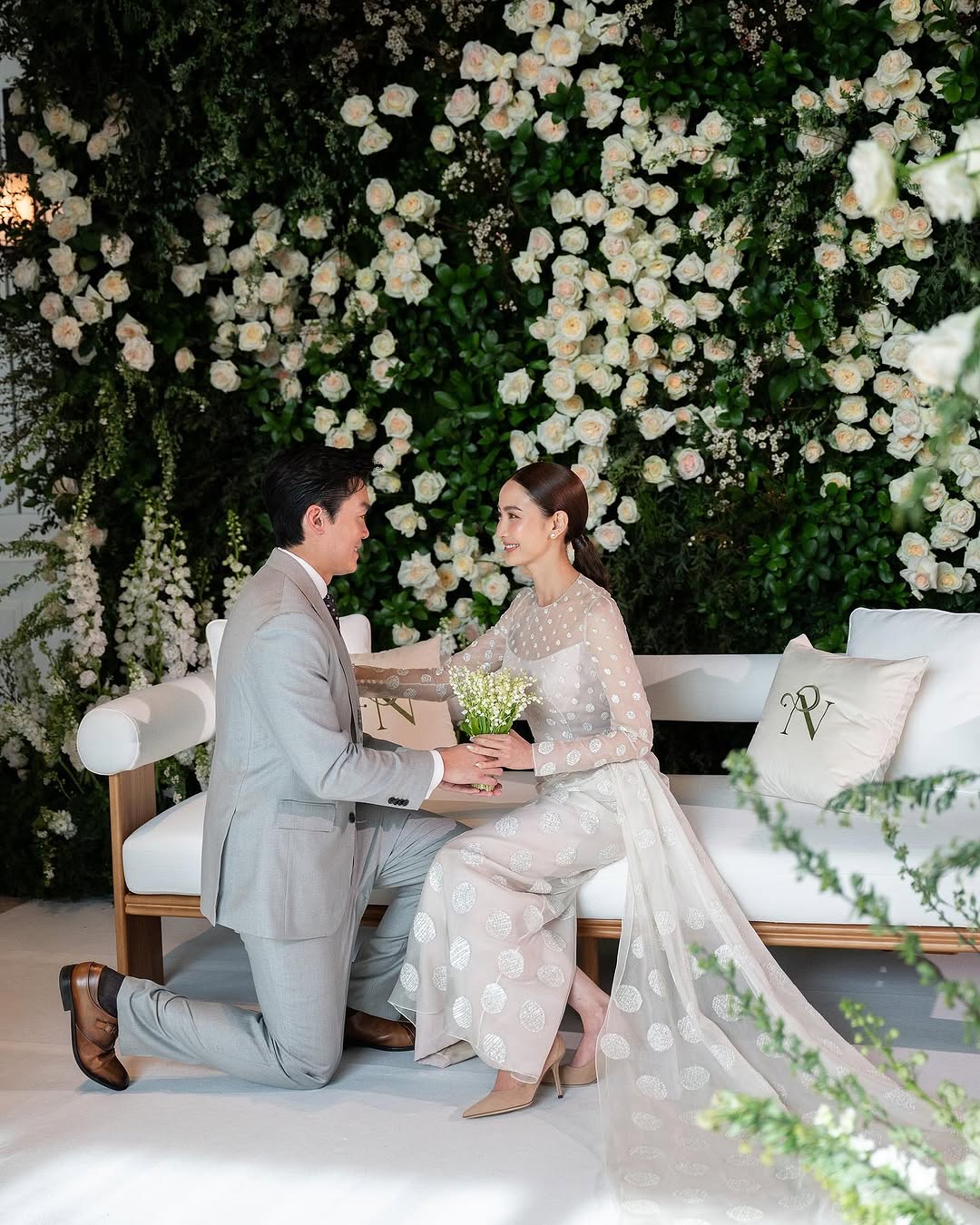 แต้ว เล่าว่างานแต่งงานวันนี้ตั้งใจจัดให้จบในวันเดียว ดังนั้นพิธีการจึงเริ่มขึ้นตั้งแต่เช้าด้วยพิธีตักบาตร เจริญพระพุทธมนต์ พิธีหมั้น ยกน้ำชา สวมแหวน รดน้ำสังข์ ซึ่งพิธีเช้าก็ได้รับเกียรติจาก อาจารย์วีรธรรม ตระกูลเงินไทย มาช่วยออกแบบชุดไทยทั้งของเจ้าสาวและเจ้าบ่าว ซึ่งความพิเศษคือตัดเย็บด้วยเทคนิคโบราณกว่าร้อยปี ส่วนชุดพิธีการอื่น ๆ ก็เป็นชุดที่เธอได้เลือกตามความ ซึ่งก็สอดคล้องกับธีมงานที่ถูกออกแบบมาให้เป็นบรรยากาศที่สดชื่น และสดใสจากดอกไม้-สนามหญ้า ให้ราวกับว่าแขกทุกคนในงานได้มาปิกนิกด้วยกัน