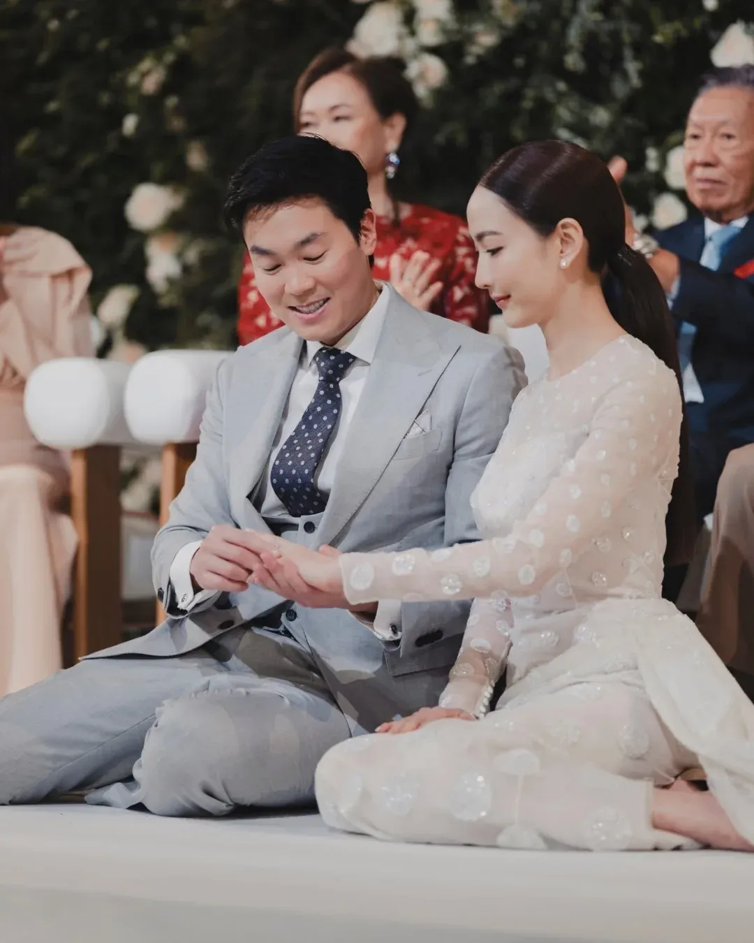 “เป็นความรู้สึกที่ตื่นเต้นมาก เพราะเราเคยไปงานแต่งงานเยอะ แต่พอเป็นงานของเรามันเป็นความรู้สึกใหม่มาก เราค่อย ๆ รับรู้ทุกความรู้สึกเหล่านั้น โดยเฉพาะตอนที่เดินเข้ามาในห้องแล้วทุกคนมองมาที่เราด้วยความรัก มอบความอบอุ่นและกำลังใจให้เรา แฮปปี้มาก ๆ ค่ะ มีความสุขจากการได้เจอคนที่เรารัก ในช่วงพิธีการก็มีหลายช่วงที่น้ำตาไหลเหมือนกัน ช่วงที่คุณพ่อคุณแม่อวยพร ฝากฝังให้เราทั้งคู่ต่างดูแลกัน ให้คติในการครองคู่ที่เน้นย้ำเรื่องความเข้าใจและการเคารพกัน เป็นความห่วงใยที่อยากให้เราครองคู่กันมั่นคง