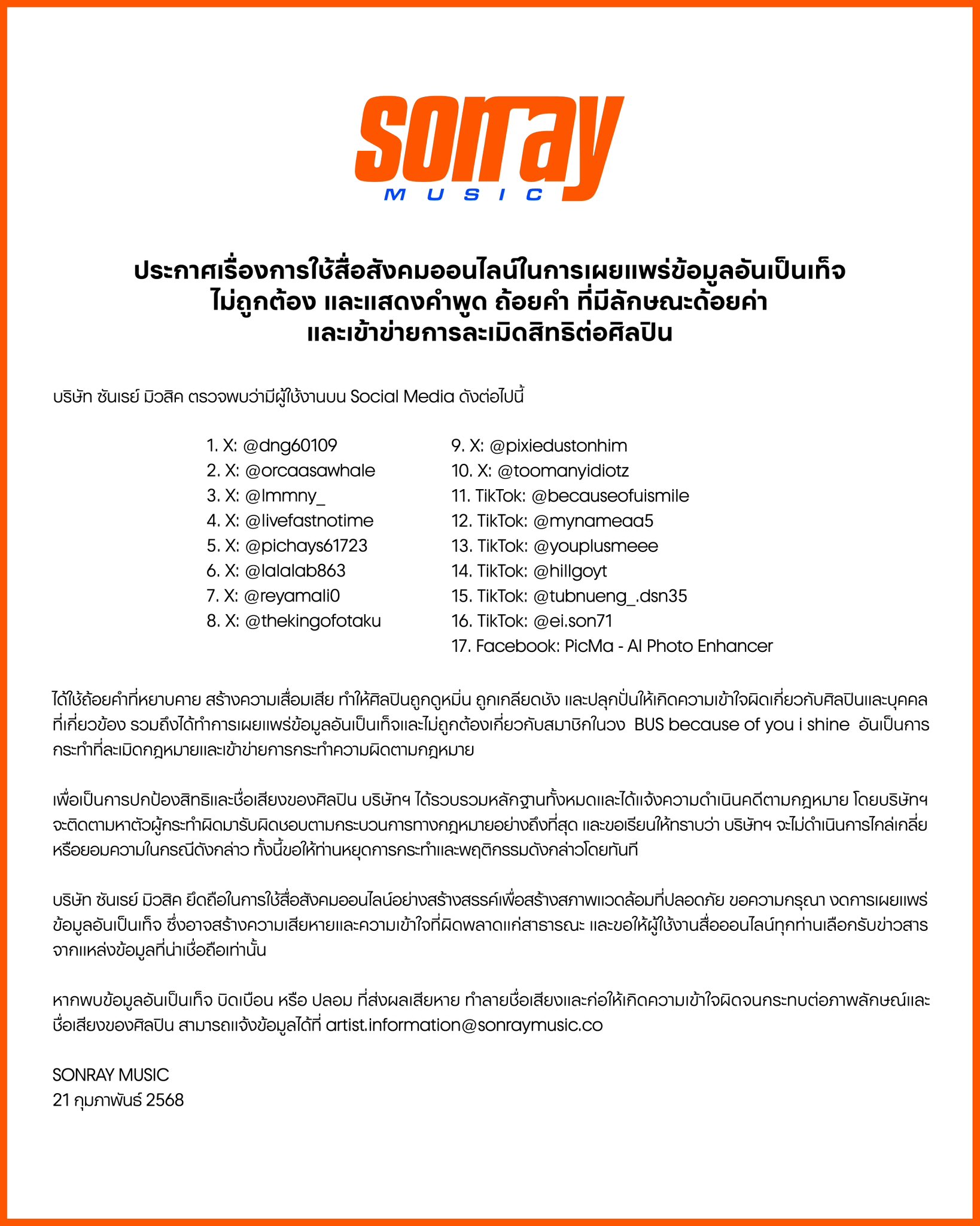 ค่าย SONRAY MUSIC ต้นสังกัดของวง BUSbecause of you i shine ออกมาตอบโต้ข่าวลือที่กำลังถูกวิพากษ์วิจารณ์บนโซเชียลมีเดีย เกี่ยวกับ เน็กซ์-ณัฐกิตติ์ แช่มดารา เมมเบอร์วง BUS หลังมีการแชร์ประเด็นความสัมพันธ์ส่วนตัว ซึ่งอาจกระทบต่อบทบาทและความนิยมในฐานะศิลปินในอนาคต จนมีหลายคนเข้าใจผิดและมีการคอมเมนต์วิจารณ์รุนแรงซึ่งทางต้นสังกัดไม่ได้นิ่งเฉยรีบออกมายืนยันว่าข่าวลือดังกล่าวไม่เป็นความจริง พร้อมกับขอความร่วมมือจากผู้ที่ปล่อยข่าวลือให้หยุดพฤติกรรมดังกล่าวที่ส่งผลกระทบต่อชื่อเสียงของศิลปิน“ประกาศชี้แจงเกี่ยวกับเหตุการณ์ที่กำลังเป็นที่พูดถึงในโลกออนไลน์ในขณะนี้ เกี่ยวกับประเด็นส่วนตัวของ นายณัฐกิตติ์ แช่มดารา (NEX)“บริษัท ซันเรย์ มิวสิค ขอชี้แจงว่า ประเด็นดังกล่าวเป็นข้อมูลที่ไม่เป็นความจริงแต่อย่างใด และขอยืนยันว่าไม่ควรมีการเผยแพร่หรือแชร์ข้อมูลที่ไม่เป็นจริงซึ่งอาจส่งผลกระทบต่อชื่อเสียงและความเป็นส่วนตัวของศิลปิน รวมถึงบุคคลที่เกี่ยวข้อง“บริษัท ซันเรย์ มิวสิค เชื่อในการใช้สื่อสังคมออนไลน์อย่างสร้างสรรค์ เพื่อสร้างสภาพแวดล้อมที่ปลอดภัยให้แก่ทุคคน เราขอความกรุณางดการเผยแพร่ข้อมูลอันเป็นเท็จ ซึ่งอาจสร้างความเสียหายและความเข้าใจที่ผิดพลาดแก่สาธารณะ และขอให้ผู้ใช้งานสื่อออนไลน์ทุกท่านเลือกรับข่าวสารจากแหล่งข้อมูลที่น่าเชื่อถือเท่านั้น“เราขอความกรุณาให้ทุกท่านเคารพในพื้นที่ส่วนตัวของศิลปินและบุคคลรอบข้าง ซึ่งเป็นสิทธิพื้นฐานที่ทุกคนสมควรได้รับ“บริษัท ซันเรย์ มิวสิค ขอขอบคุณทุกการสนับสนุน ความเข้าใจ และกำลังใจที่ท่านมอบให้กับศิลปินมาโดยตลอด”ภาพ : nex.busofficial