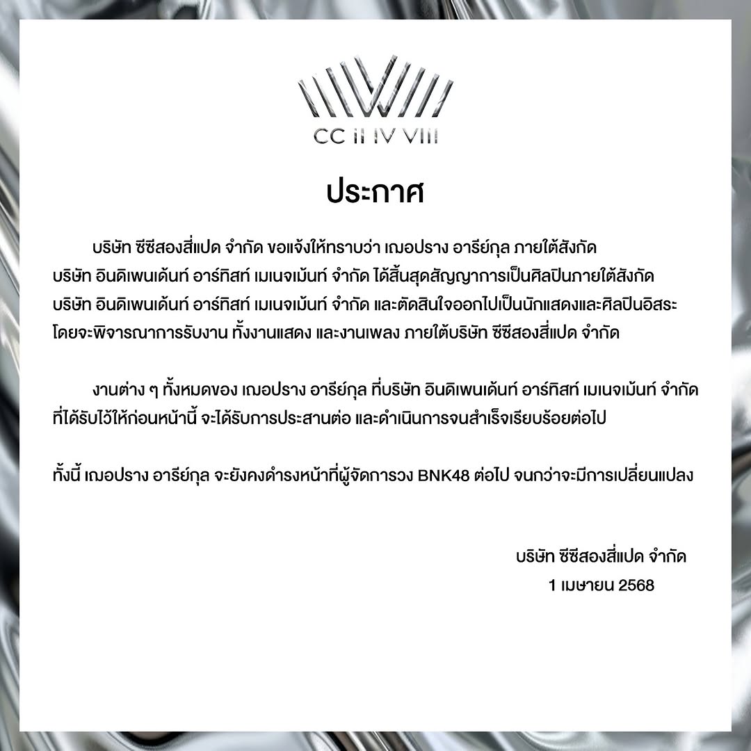 แสดงความเสียใจกับ เฌอปราง อารีย์กุล สมาชิกและผู้จัดการวง BNK48 สำหรับความสูญเสียจากเหตุการณ์น้องชายอย่าง ฌาน อารีย์กุล วัย 19 ปี อดีตนักกีฬาโบว์ลิ่งเยาวชนทีมชาติ พลัดตกจากคอนโดมิเนียนเป็นเหตุให้เสียชีวิต เมื่อเวลา 02.30 น. วันที่ 1 มีนาคม 2566 โดยเมื่อช่วงสาย เฌอปราง และครอบครัวเดินทางไปยังนิติเวชศาสตร์ โรงพยาบาลจุฬาลงกรณ์ เพื่อรับศพไปประกอบพิธีทางศาสนาภายหลังจากมีการนำเสมอข่าวออกไป ก็มีแฟนเพลง รวมไปถึงเพื่อนสมาชิกวง BNK48 และ CGM48 ก็ได้โพสต์ข้อความเพื่อแสดงความเสียใจ และส่งกำลังใจให้กับ เฌอปราง และครอบครัวผ่านโซเชียลมีเดียขณะเดียวกันต้นสังกัดอย่างค่าย iAM ได้ส่งหนังสือเพื่อข้อความกรุณา งดการเผยแพร่ภาพและคลิปเหตุการณ์ในกล้องวงจรปิด เพื่อเป็นการให้เกียรติผู้เสียชีวิต และครอบครัว ส่วนพิธีกรรมทางศาสนา ทางครอบครัวจะจัดขึ้นเป็นการส่วนตัว และขออภัยหากไม่ได้เรียนเชิญสื่อมวลชนไปร่วมทำข่าวEFM94 ขอแสดงความเสียใจกับ เฌอปราง และครอบครัวสำหรับความสูญเสียในครั้งนี้ด้วยภาพ : iAM