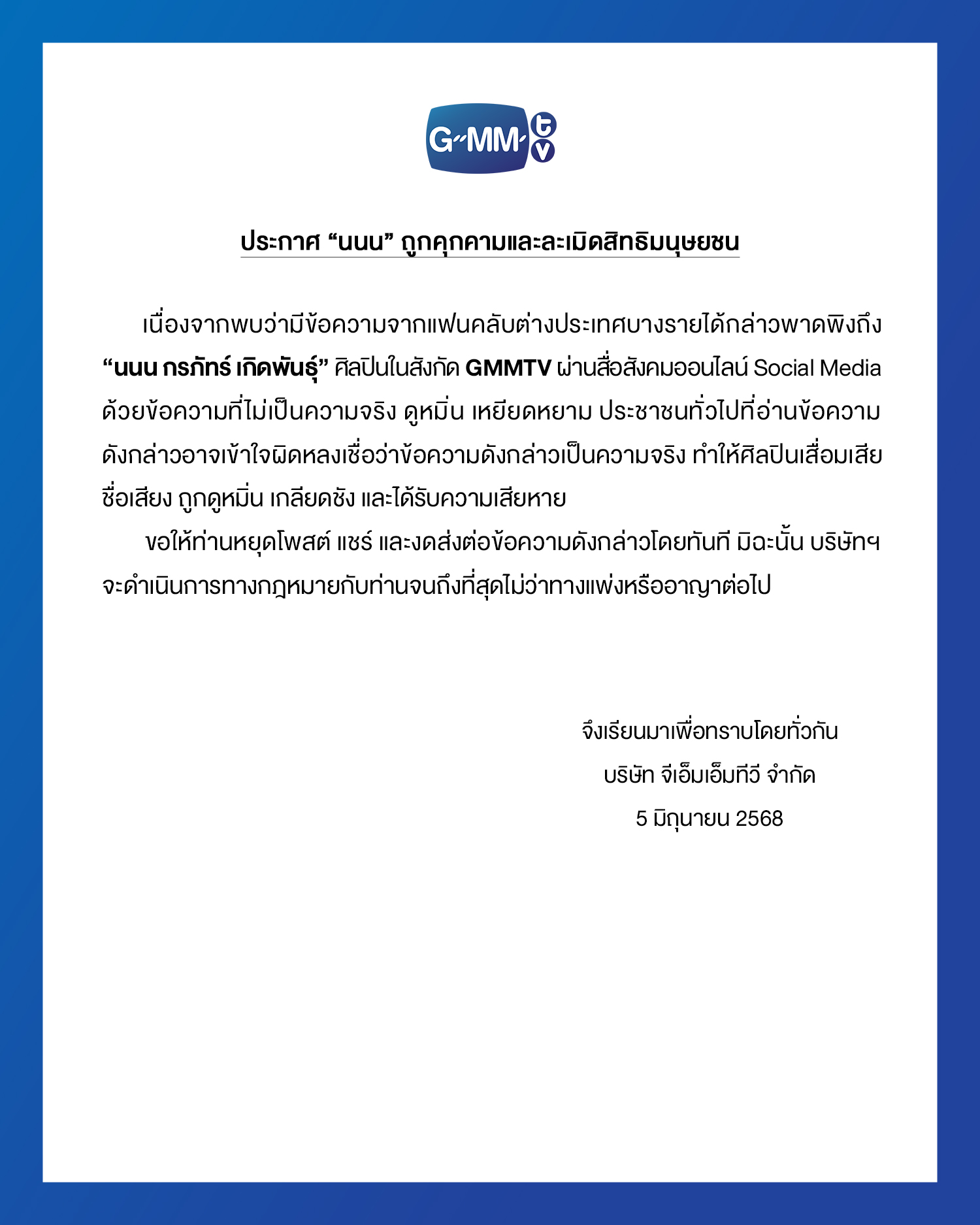 GMMTV ต้นสังกัดของนักแสดงหนุ่มมากความสามารถ นนน-กรภัทร์ เกิดพันธุ์ ออกแถลงการณ์แสดงจุดยืนในการปกป้องสิทธิ์ของศิลปินในสังกัด หลังพบว่ามีกลุ่มแฟนคลับต่างประเทศบางรายเผยแพร่ข้อความผ่านสื่อสังคมออนไลน์ที่มีเนื้อหาไม่เป็นความจริง พาดพิงและเหยียดหยามนนนอย่างไม่เหมาะสม จนอาจทำให้สาธารณชนเข้าใจผิด และส่งผลกระทบต่อชื่อเสียงอย่างรุนแรง
