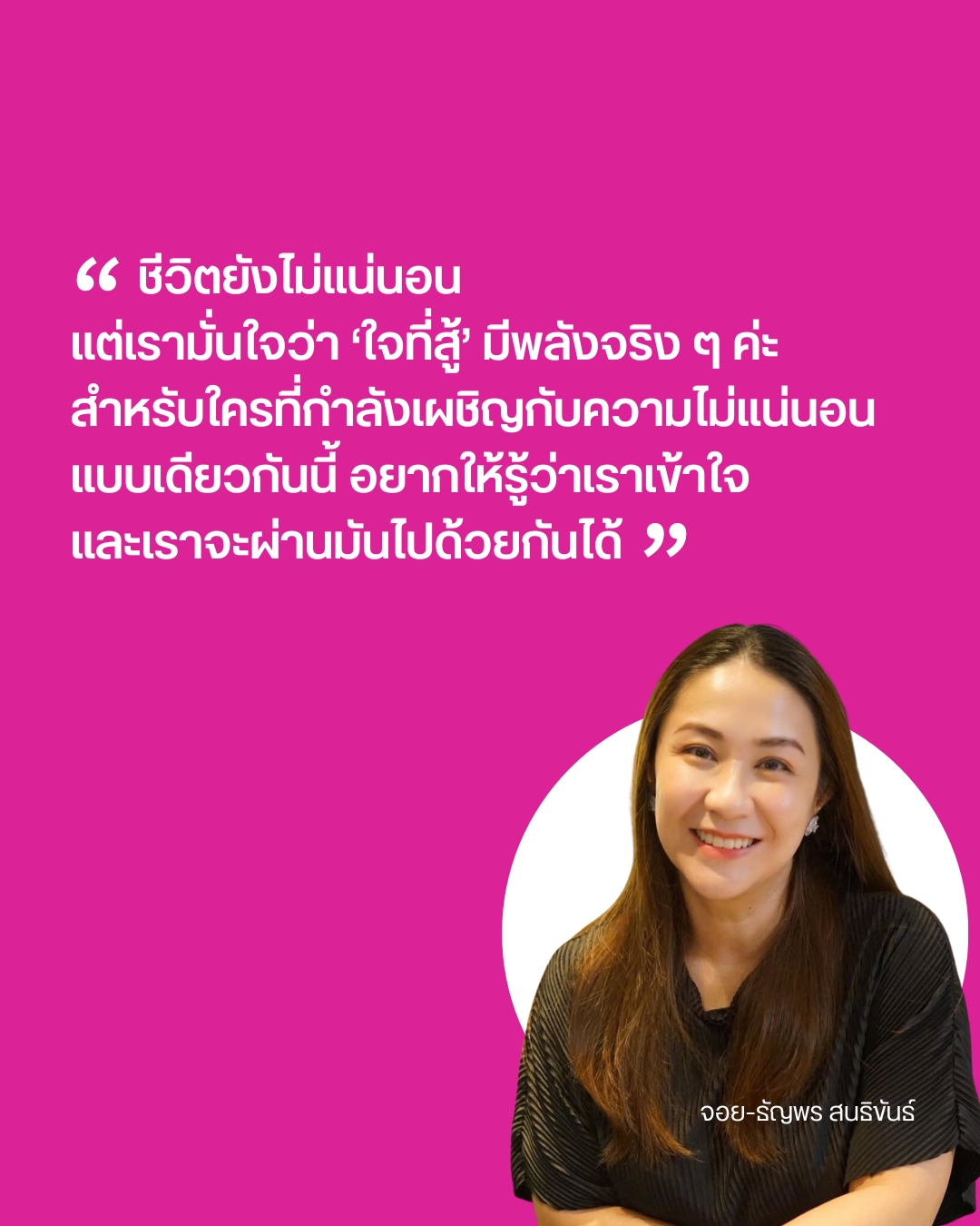 นอกจากจะขอบคุณร่างกายและกำลังใจรอบตัว จอย ยังส่งพลังบวกกลับไปยังผู้ที่กำลังต่อสู้กับโรคร้ายหรือเผชิญกับความไม่แน่นอนในชีวิต ว่าเธอเข้าใจ และอยากเป็นอีกหนึ่งของแรงใจให้ก้าวผ่านไปด้วยกัน “ชีวิตยังไม่แน่นอน แต่เรามั่นใจว่าใจที่สู้มีพลังจริง ๆ สำหรับใครที่กำลังเผชิญกับความไม่แน่นอนแบบเดียวกันนี้ อยากให้รู้ว่าเราเข้าใจและเราจะผ่านมันไปด้วยกันได้”