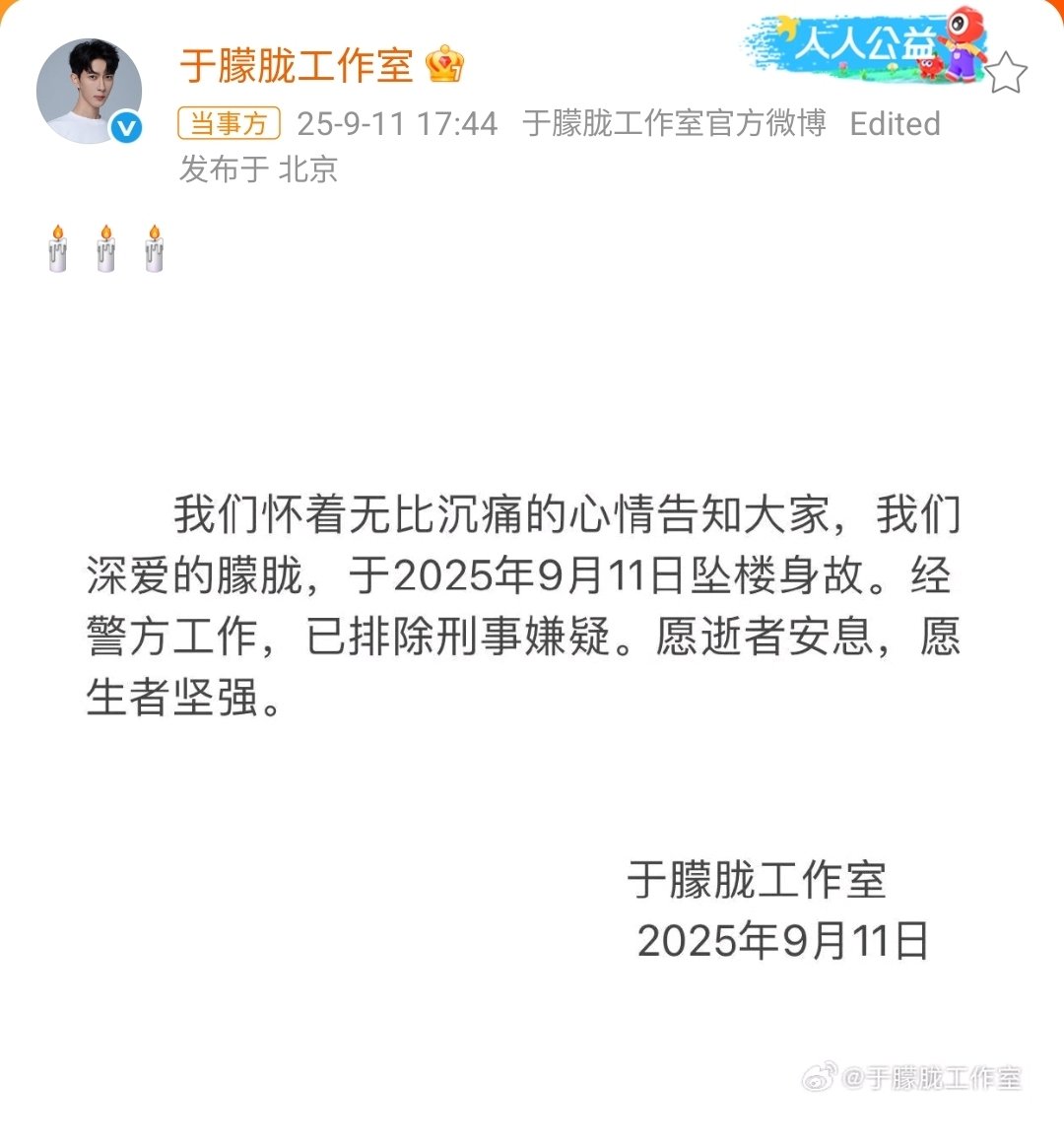 เป็นข่าวเศร้าที่สร้างความสะเทือนใจให้กับแฟนซีรีส์ทั่วเอเชีย เมื่อมีการรายงานว่า อวี๋เมิ่งหลง (Yu Menglong) นักแสดง นักร้อง และผู้กำกับชาวจีน ได้เสียชีวิตลงจากอุบัติเหตุพลัดตกจากที่สูงในกรุงปักกิ่ง ท่ามกลางความสงสัยและการรอคอยคำยืนยันจากต้นสังกัด