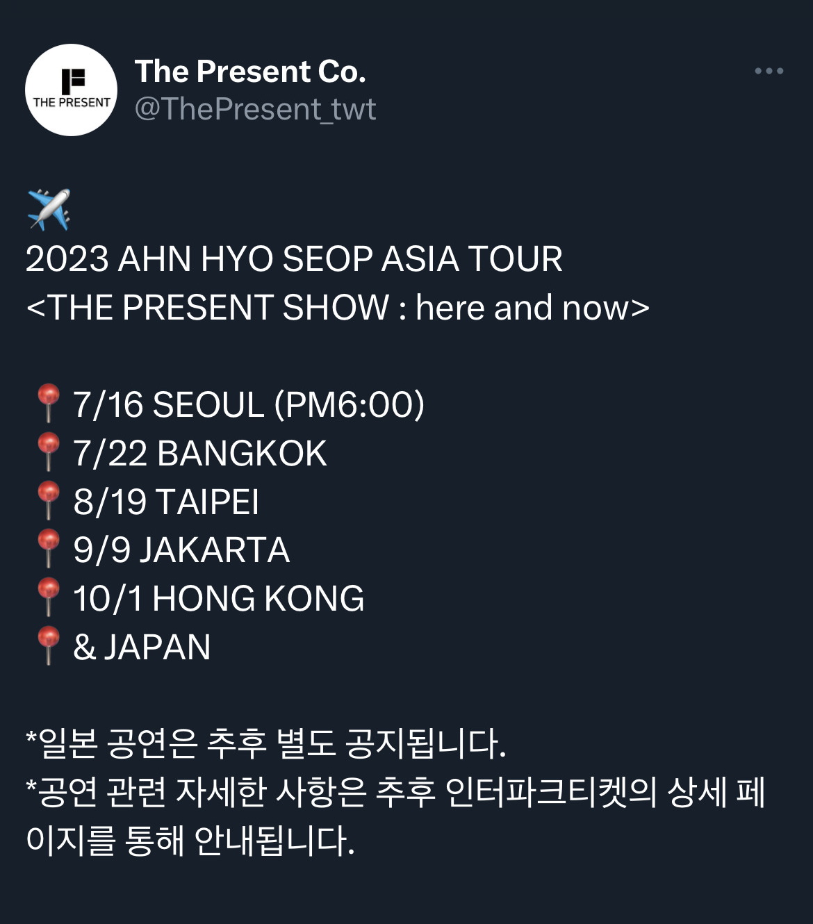บอกเลยว่าทำเอาหัวใจสั่นหวั่นไหวไปหมดแล้วกับการประกาศจัดเอเชียทัวร์แฟนมีตติ้ง 2023 อันฮโยซอบ เอเชีย ทัวร์ <เดอะ เพรสเซนต์ โชว์ อิน แบงคอก> “เฮียร์ แอนด์ นาว” (2023 AHN HYO SEOP ASIA TOUR <THE PRESENT SHOW in BANGKOK> “here and now”) ของนักแสดงหนุ่มรูปหล่อสูงยาวเข่าดี “อันฮโยซอบ” (Ahn Hyo Seop) หรือคุณหมอซออูจินแห่งโรงพยาบาลทลดัมที่ใครๆ กำลังอินกับผลงานซีรีส์เกาหลีเรตติ้งแรงเรื่องล่าสุด Dr. Romantic 3 รวมถึงผลงานสุดปังก่อนหน้านี้ Business Proposal กับบทบาทท่านประธานคังแทมูที่ทุกคนตกหลุมรักหนักมากและรอวันได้พบเจอตัวจริงสักครั้ง