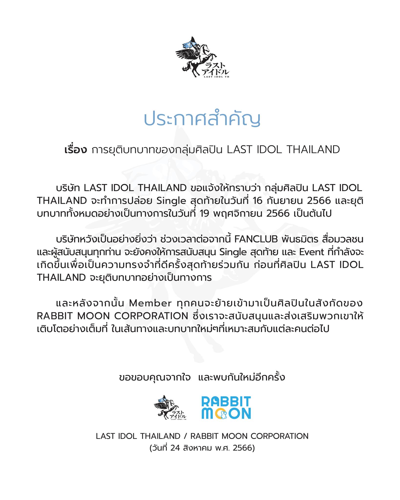 “บริษัท LAST IDOL THAILAND ขอแจ้งให้ทราบว่า กลุ่มศิลปิน LAST IDOL THAILAND จะทำการปล่อยซิงเกิลสุดท้ายในวันที่ 16 กันยายน 2566 และยุติบทบาททั้งหมดอย่างเป็นทางการในวันที่ 19 พฤศจิกายน 2566 เป็นต้นไป