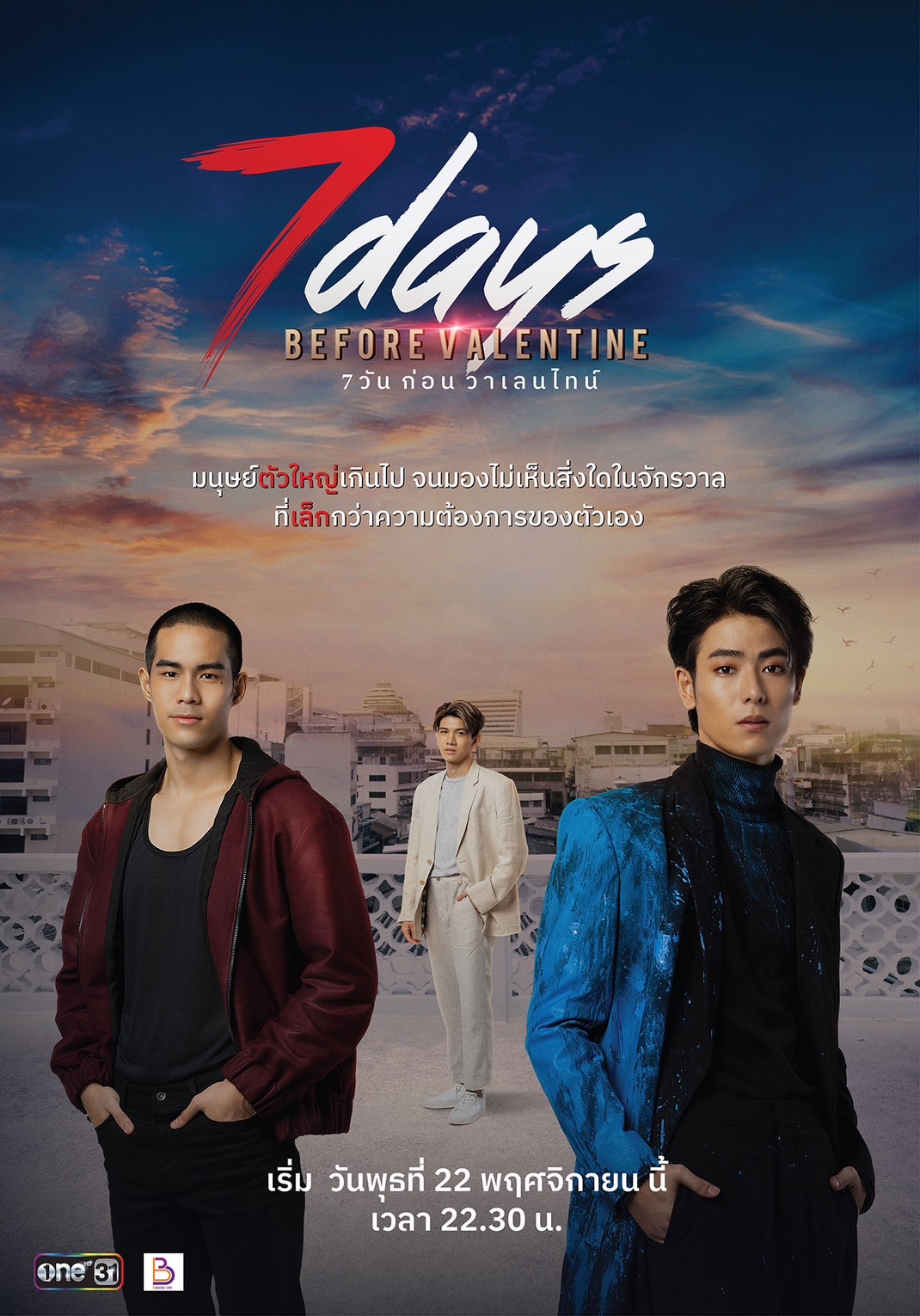 ปลายปีนี้เรามีผลงานซีรีส์อีกเรื่องที่อยากชวนทุกคนให้รอติดตาม สำหรับ ‘7 Days before Valentine’ (7 วันก่อนวาเลนไทน์) จากค่าย BANDAI BAR ที่ไม่เพียงแต่จะเด่นด้วยทีมนักแสดงนำดาวรุ่งของวงการซีรีส์ ทั้ง เจตน์-สมเจตน์ แซ่จาง, อะตอม-ณฐาภพ เคนจันทึก และ แต๊ง-เอกดนัย ใจสะอาด เรื่องราวของ ‘7 Days before Valentine’ ยังแปลกใหม่และน่าติดตาม โดยเรื่องนี้ตั้งคำถามกับเราก่อนว่า หากวันหนึ่งวันใดได้รับพรวิเศษจากยมทูตคิวปิด สามารถทำให้คน ๆ หนึ่ง ‘หายไป’ เพื่อให้เราได้สิ่งใดสิ่งหนึ่ง ‘คืนกลับมา’ เป็นคุณจะใช้พรข้อนั้นหรือ?