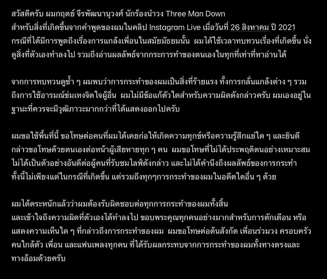 “สวัสดีครับ ผมกฤตย์ จีรพัฒนานุวงศ์ นักร้องนำวง Three Man Down สำหรับสิ่งที่เกิดขึ้นจากคำพูดของผมในคลิป Instagram Live เมื่อวันที่ 26 สิงหาคม ปี 2021 กรณีที่ได้มีการพูดถึงเรื่องการแกล้งเพื่อนในสมัยมัธยมนั้น ผมได้ใช้เวลาทบทวนเรื่องที่เกิดขึ้น นั่งดูสิ่งที่ตัวเองทำลงไป รวมถึงอ่านผลลัพธ์จากกระการทำของตนเองในทุกที่เท่าที่หาอ่านได้