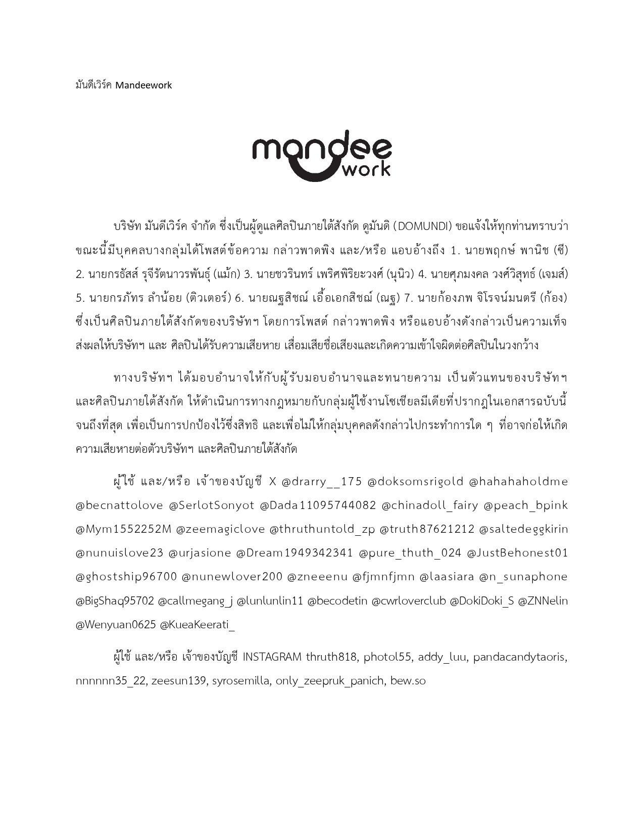 “บริษัทฯ ขอยืนยันที่จะปกป้องและดำเนินการตามขั้นตอนของกฎหมายแก่ผู้ ที่กระทำความผิดหรือก่อให้เกิดความเสียหายต่อทั้งตัวศิลปินและบริษัทฯ ขอขอบคุณทุกท่านที่ให้การสนับสนุนบริษัทฯ และศิลปินภายใต้สังกัดของบริษัทฯ ด้วยดีเสมอมา”