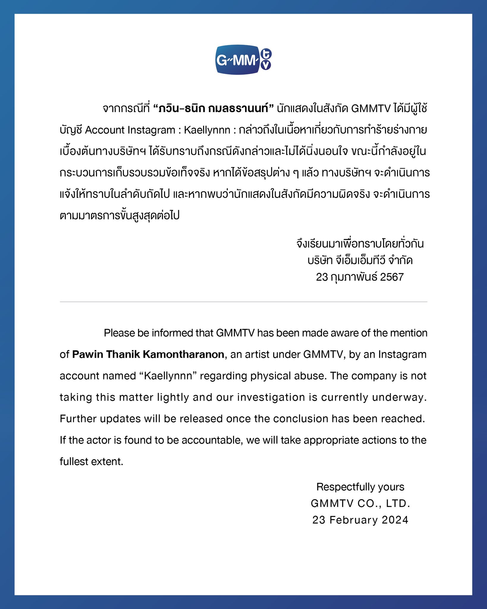 อีกทั้งหากพบว่า ภวิน ในฐานะศิลปินและนักแสดงในสังกัดมีความผิดจริง จะดำเนินการตามมาตรการขั้นสูงสุดต่อไป