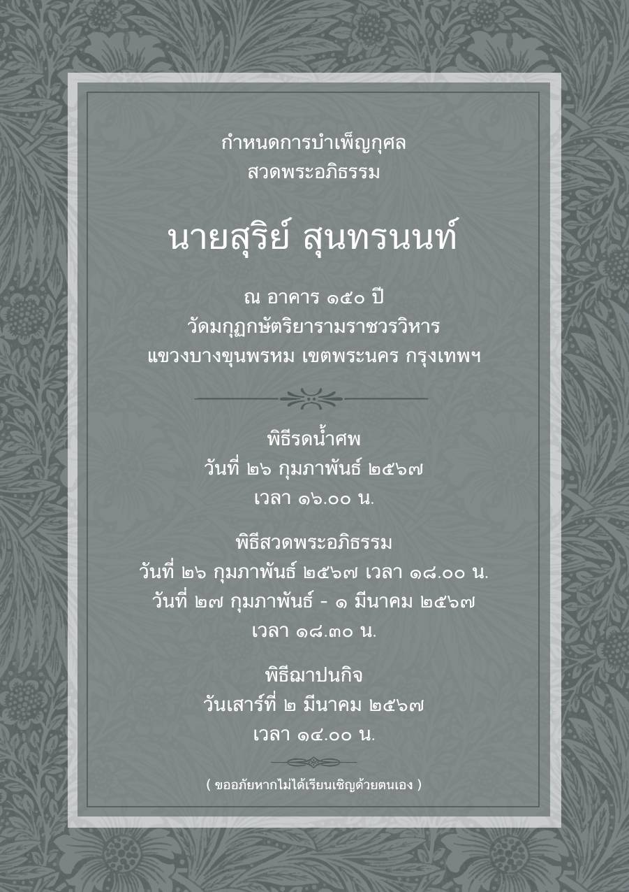 มีเพื่อนศิลปินนักแสดงเข้าไปร่วมส่งกำลังใจและแสดงความเสียใจต่อการสูญเสียในครั้งนี้ ส่วนกำหนดการบำเพ็ญกุศลและสวดพระอภิธรรม คุณพ่อสุริย์ สุนทรนนท์ จะมีขึ้น ณ อาคาร ๑๔๐ ปี วัดมกุฏกษัตริยารามราชวรวิหาร แขวงบางขุนพรหม เขตพระนคร กรุงเทพฯ