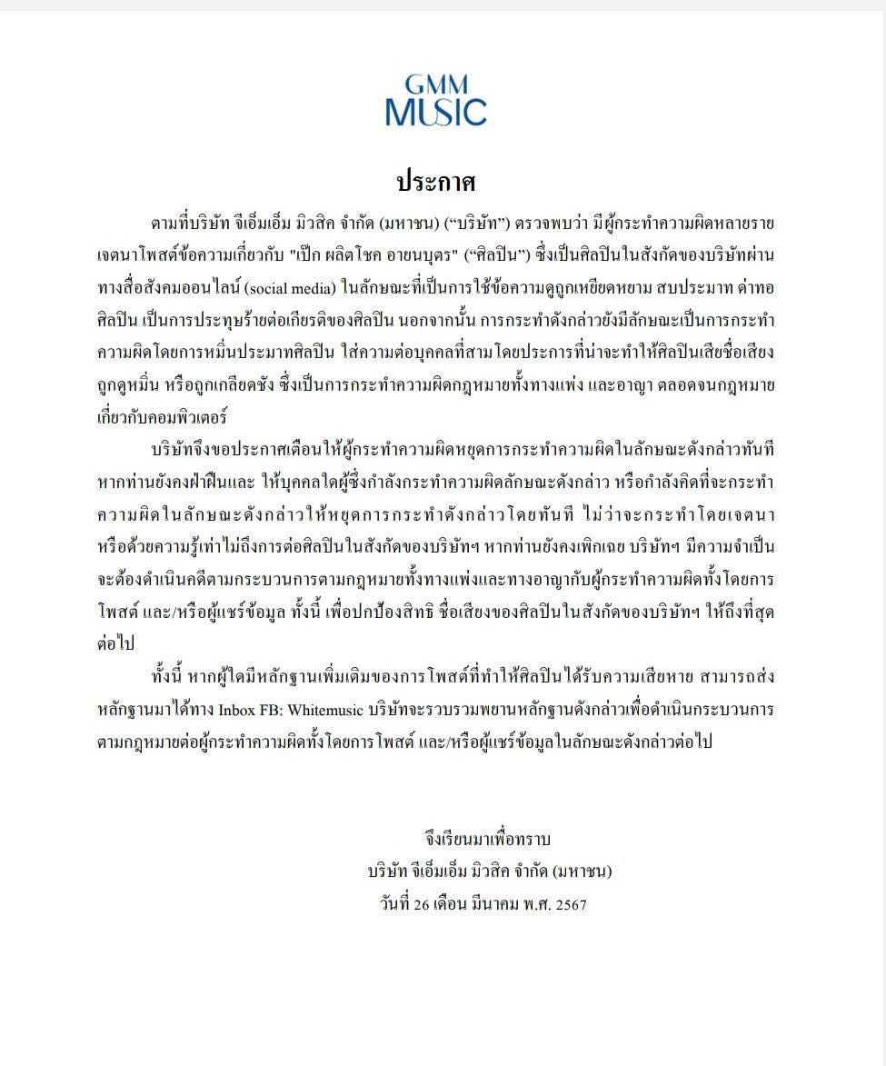 “ตามที่บริษัท จีเอ็มเอ็ม มิวสิค จำกัด (มหาชน) ตรวจพบว่า มีผู้กระทำความผิดหลายราย เจตนาโพสต์ข้อความเกี่ยวกับ เป๊ก-ผลิตโชค อายนบุตร ซึ่งเป็นศิลปินในสังกัดของบริษัทผ่านทางสื่อสังคมออนไลน์ในลักษณะที่เป็นการใช้ข้อความดูถูกเหยียดหยาม สบประมาท ด่าทอศิลปิน เป็นการประทุษร้ายต่อเกียรติของศิลปิน นอกจากนั้นการกระทำดังกล่าวยังมีลักษณะเป็นการกระทำความผิดโดยการหมิ่นประมาทศิลปิน ใส่ความต่อบุคคลที่สามโดยประการที่น่าจะทำให้ศิลปินเสียชื่อเสียง ถูกดูหมิ่น หรือถูกเกลียดชัง ซึ่งเป็นการกระทำความผิดกฎหมายทั้งทางแพ่ง และอาญา ตลอดจนกฎหมายเกี่ยวกับคอมพิวเตอร์