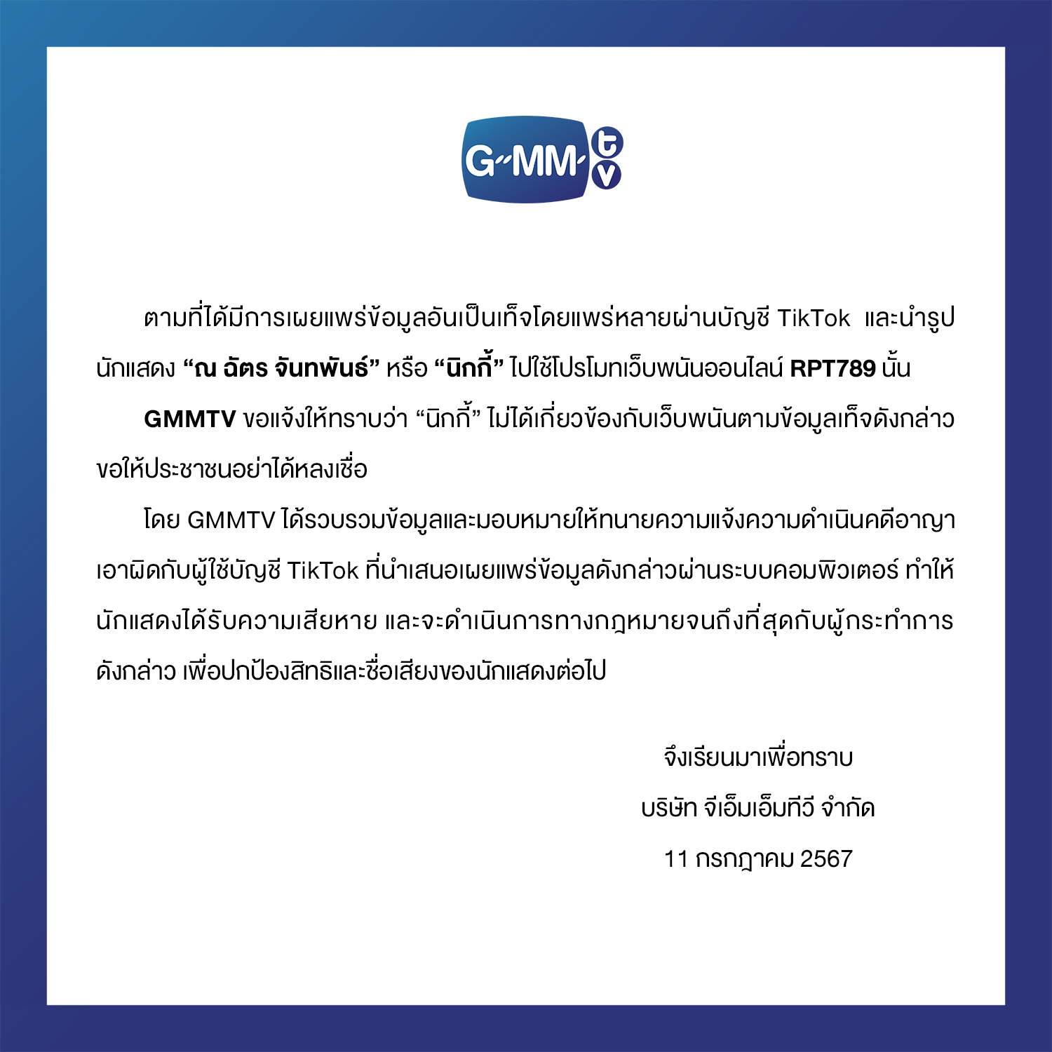 เดินหน้าเอาผิดเต็มที่ สำหรับ 2 นักแสดงชื่อดังอย่าง กัน อรรถพันธ์ และ มุก วรนิษฐ์ หลังพบว่าถูกนำภาพ และชื่อไปแอบอ้างในการโปรโมทเว็บพนันออนไลน์ พร้อมทั้งระบุว่าทั้ง 2 เป็นแบรนด์แอมบาสเดอร์ จนทำให้หลายคนเกิดความเข้าใจผิด และเจ้าตัวก็ได้ออกมายืนยันแล้วว่าไม่มีส่วนเกี่ยวข้อง ล่าสุดต้นสังกัดอย่าง GMMTV ก็ได้ออกมาเปิดเผยความคืบหน้าของเรื่องนี้ว่า หลังตรวจสอบข้อมูลแล้ว ทั้ง กัน และ มุก ได้มอบอำนาจให้ทางทนายเจน ไพศาล เข้าพบพนักงานสอบสวน เพื่อให้เจ้าหน้าที่ดำเนินคดีอย่างถึงที่สุดกับเว็บไซต์พนันออนไลน์ชื่อ “วินบล๊อกซ์ Winbox, Winbox Thailand 06 และ Winbox Thailand 08” ที่นำรูปภาพไปใช้ในการชักชวนเล่นพนันออนไลน์ โดยที่ไม่ได้รับอนุญาต และเนื่องด้วยเป็นการกระทำที่นอกจากจะละเมิดสิทธิแล้ว ยังถือว่ามีวัตถุประสงค์ที่มิชอบด้วยกฏหมาย ดังนั้นหากพบการกระทำผิดซ้ำอีก ทาง GMMTV จะดำเนินการเอาผิดถึงที่สุดภาพ : gmm-tv.com/artists