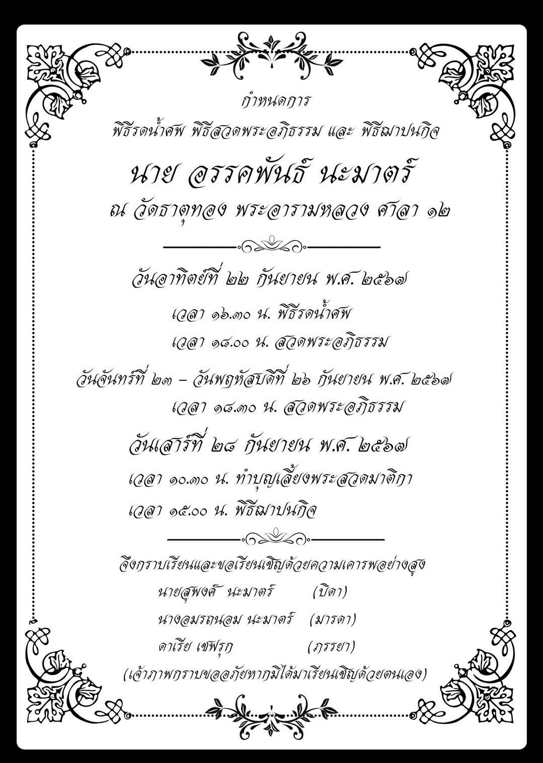 ทางด้านครอบครัวของ อ๋อม ได้ออกมาแจ้งรายละเอียดเกี่ยวกับพิธีรดน้ำศพ พิธีสวดพระอภิธรรม และพิธีฌาปนกิจว่า จะมีการนำร่างของเขาไปบำเพ็ญกุศล ณ วัดธาตุทอง โดยพิธีรดน้ำศพจะมีขึ้นเวลา 16.00 น. วันที่ 22 กันยายน 2567 และจะมีพิธีสวดพระอภิธรรมวันที่ 22-26 กันยายน 2567 ส่วนพิธีฌาปนกิจจะจัดขึ้นวันที่ 27 กันยายน 2567