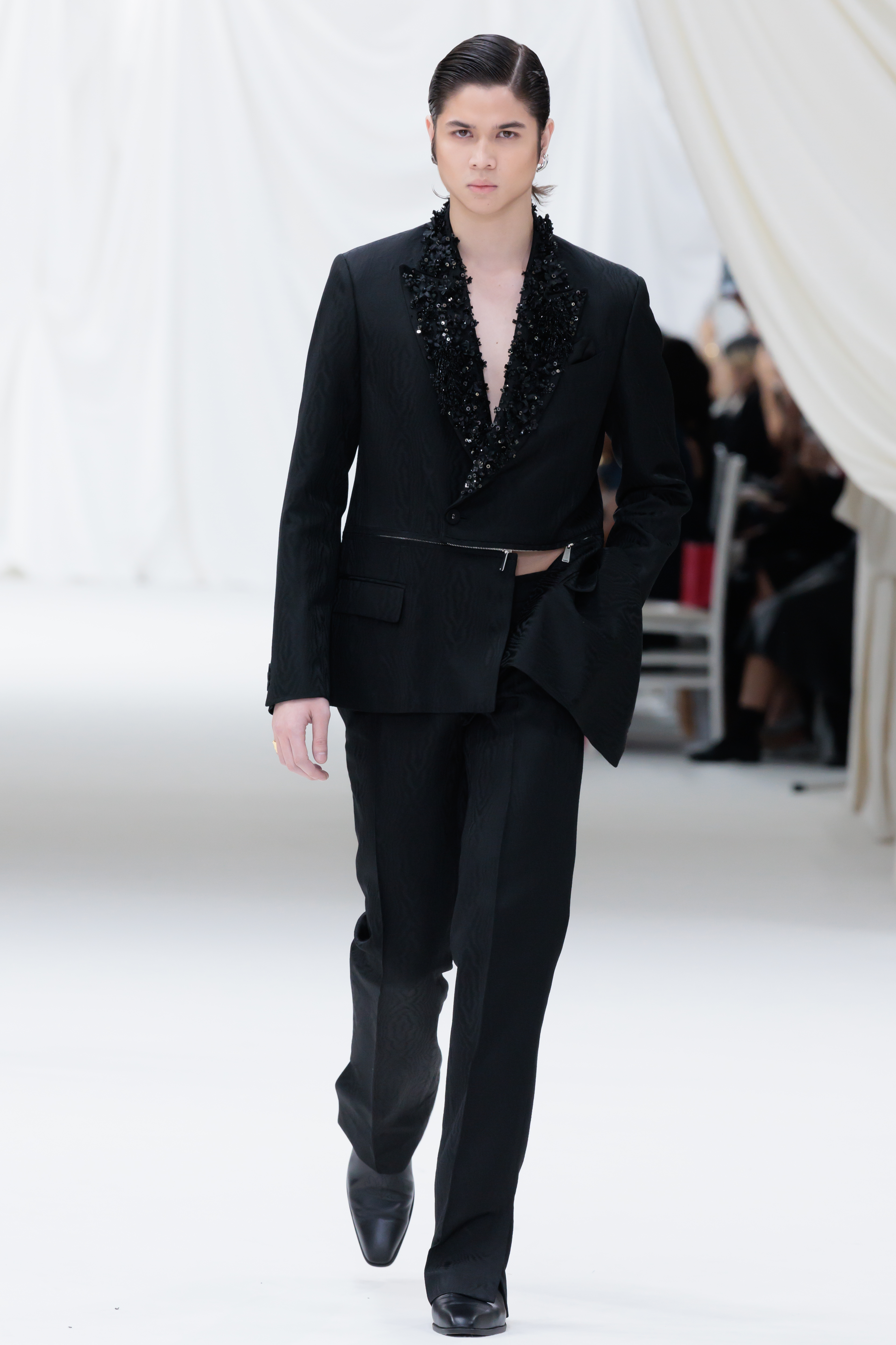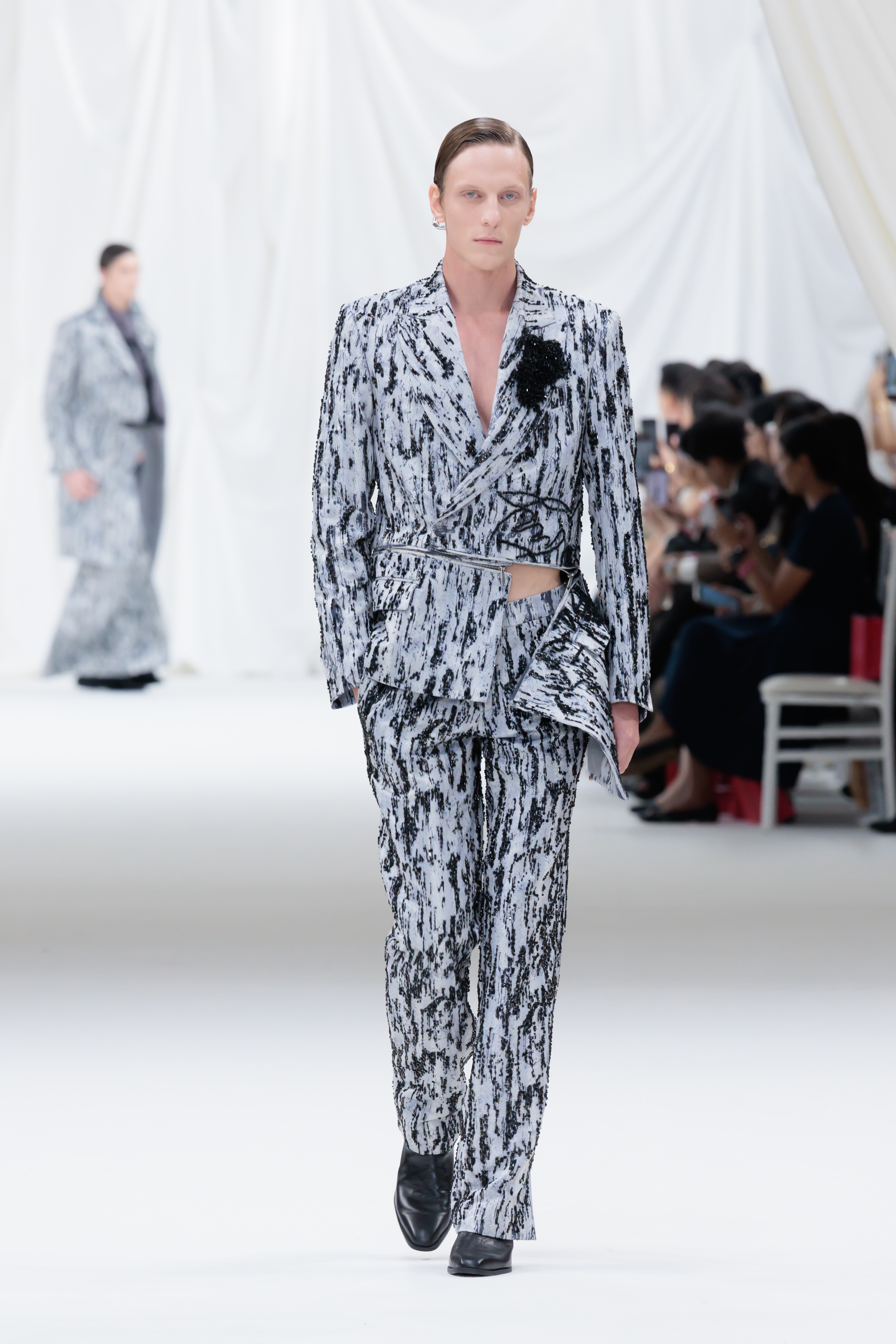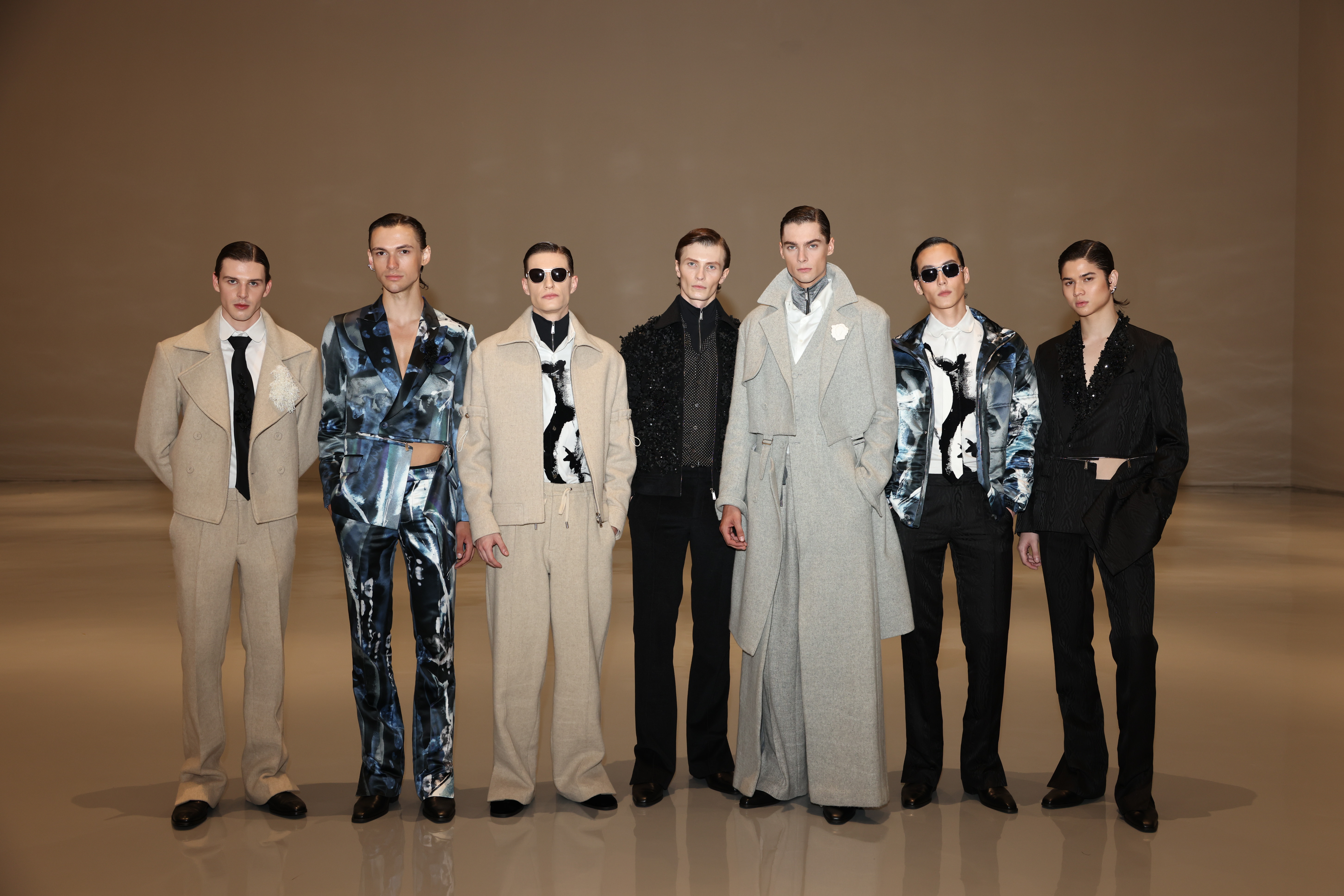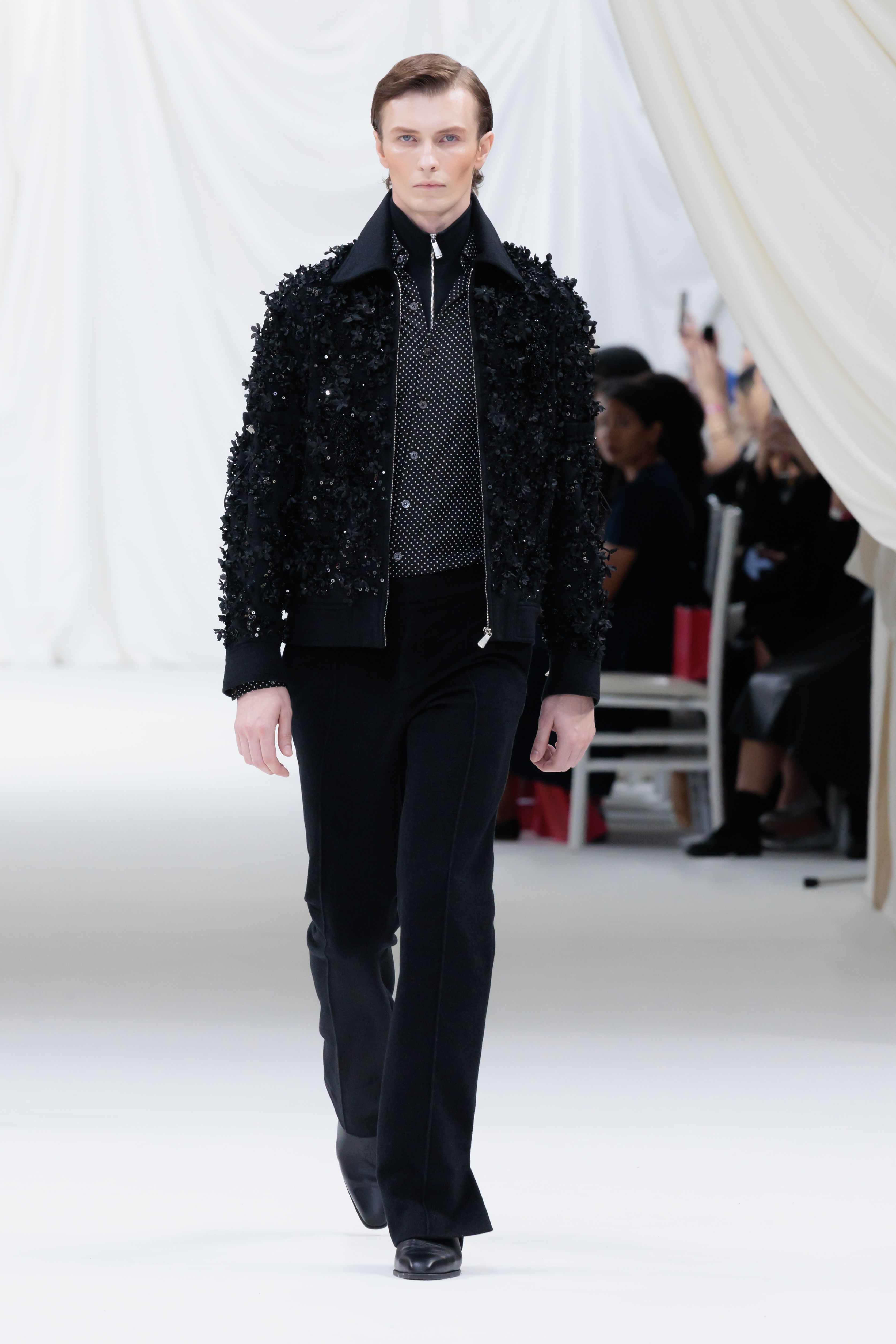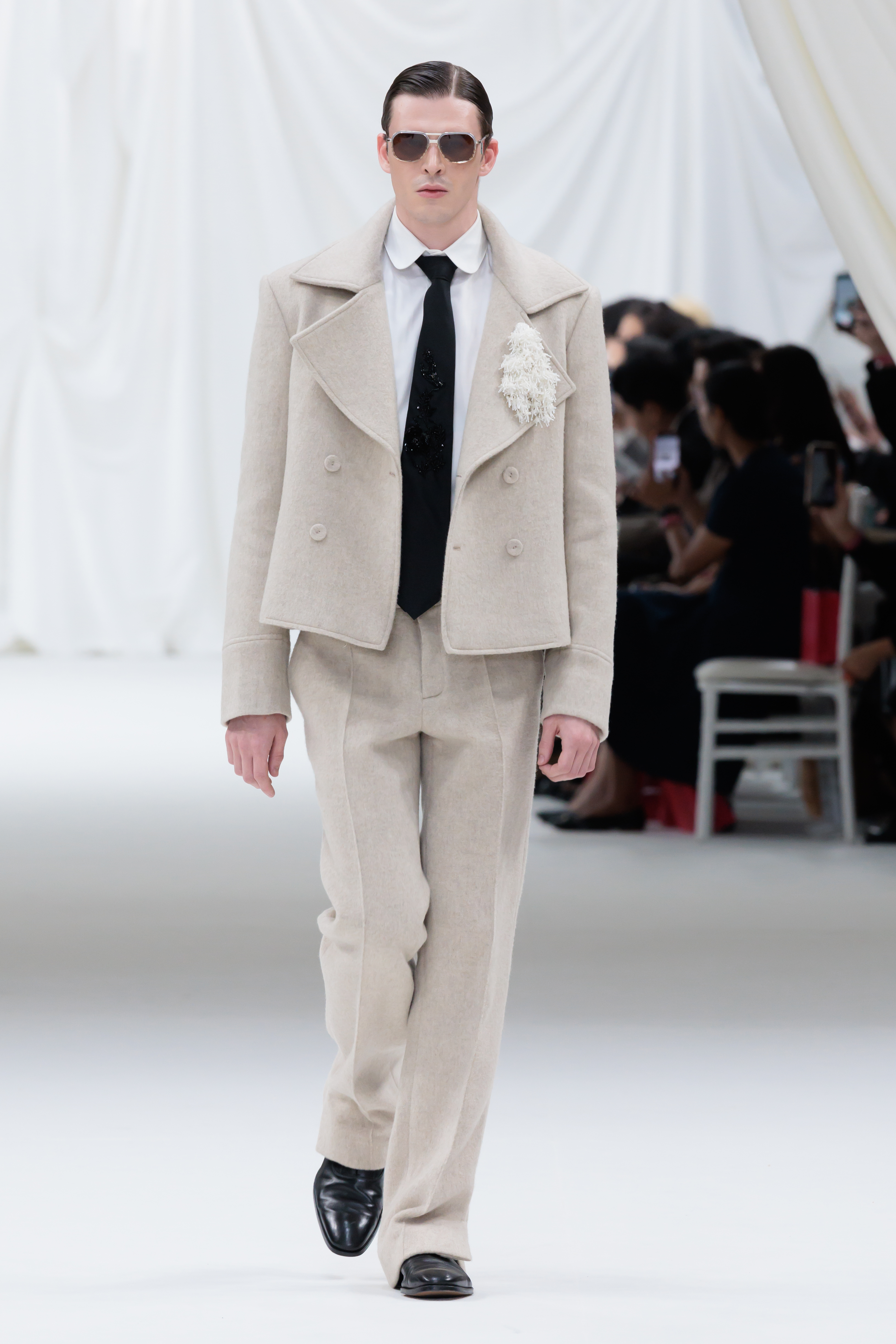 เสื้อผ้าสำหรับสุภาพบุรุษคงไว้ซึ่งความโก้หรูและพิถีพิถัน ทว่าซ่อนเร้นความมีเอกลักษณ์ผ่านลายพริ้นต์ทีแปรงดั่งผลงานจากปลายพู่กันของศิลปิน เพิ่มความท้าทายด้วยโทนสีน้ำเงิน (electric blue) ตัดกับความโรแมนติคของสีเบชและสีเทาที่ดูสุขุม นอกจากนี้เต็มไปด้วยรายละเอียดของงานปักอันพิถีพิถันที่ร้อยเรียงอย่างอ่อนโยนบนเสื้อตัวนอก (outerwear) ชิ้น must-have สำหรับฤดูกาล