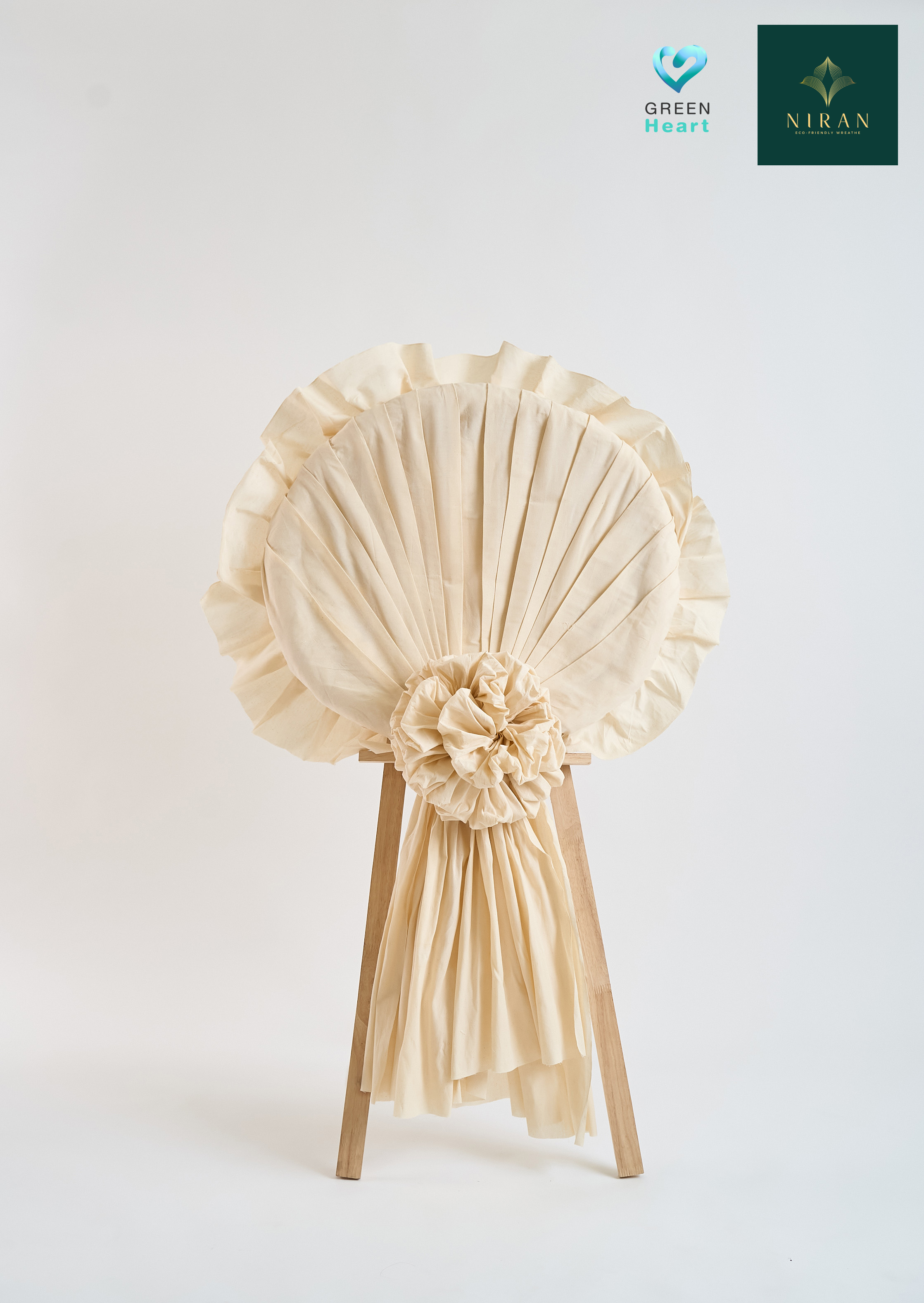 และอีกเหตุผลที่เราเลือกใช้สีของผ้าดิบเลย เพราะเรามองเรื่องผลกระทบต่อสิ่งแวดล้อมด้วย เพราะการฟอกให้ผ้าขาว มันเป็นกระบวนการที่ต้องใช้เคมี และสร้างมลพิษเพิ่มเติม เราเลยมองว่าไม่มีความจำเป็นที่จะต้องฟอกสีผ้าดิบที่ใช้ทำพวงหรีดของเรา