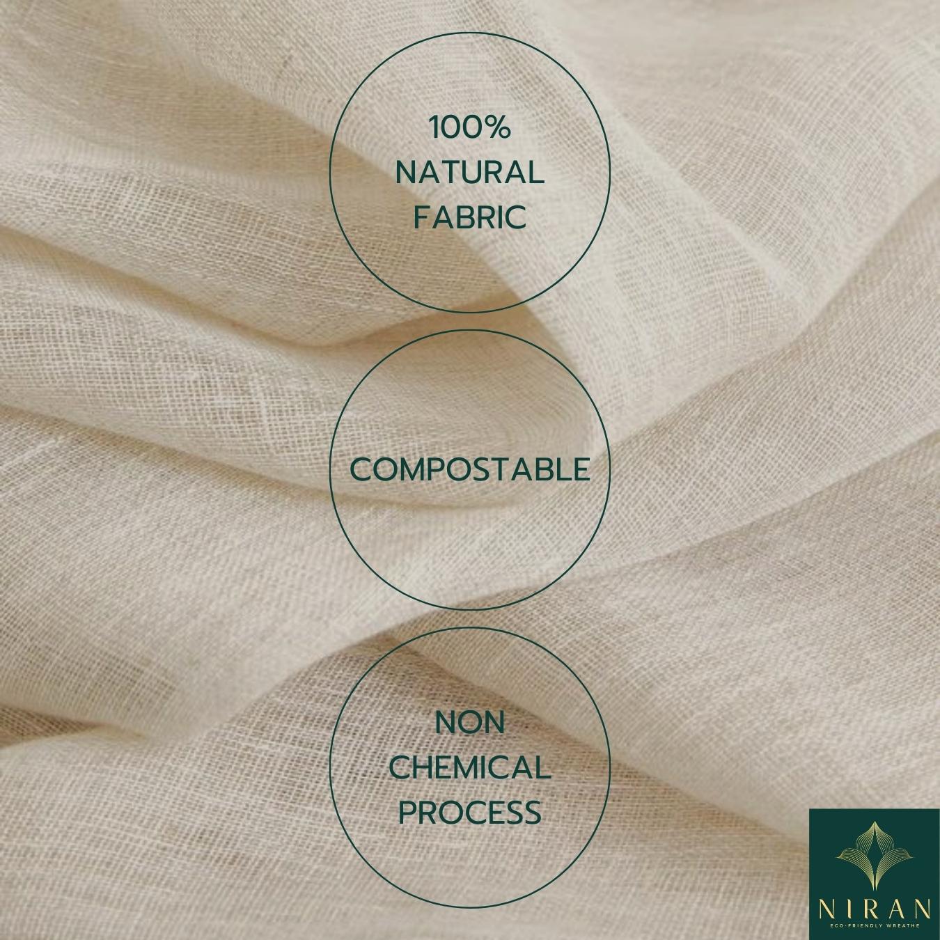 ส่วนพวงหรีดของนิรันดร์ หากแกะหมุดออก ผ้าดิบที่ได้จะแยกเป็นผืน ๆ ซึ่งจะเป็นผ้าที่ได้ขนาดมาตรฐานอยู่แล้ว ผ้า 1 ผืน จะมีความยาว 3 หลา ซึ่งเป็นขนาดที่สามารถใช้บริจาคได้เลย เพราะจะสามารถห่อศพได้ทุกร่างอยู่แล้วค่ะ