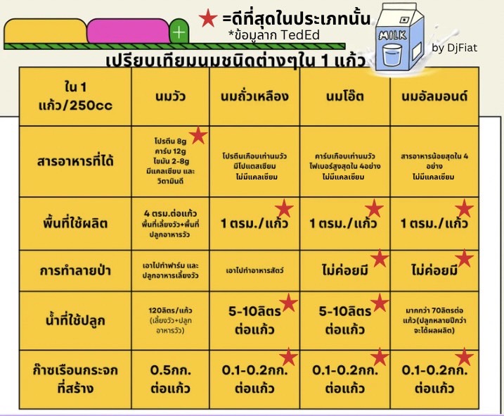 ทิ้งท้าย เรื่องอาหาร เฟี้ยตสรุปตาราง เปรียบเทียบระหว่าง นมวัว นมถั่วเหลือง นมโอ๊ต และ นมอัลมอนด์ ทั้งประโยชน์ทางสารอาหาร และ ผลกระทบต่อสิ่งแวดล้อม โดยดาวแดง หมายถึง ทำคะแนนได้ดี ในหมวดนั้น ได้ผลดังนี้