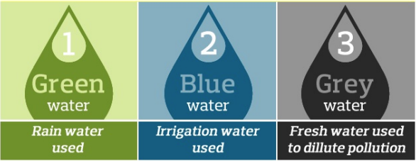 1. วอเตอร์ฟุตพริ้นท์สีเขียว (Green Water Footprint) หมายถึง ปริมาณน้ำจากฝนที่ตกลงในพื้นที่เพาะปลูกและถูกเก็บกักในเขตรากถูกพืชดูดขึ้นมาใช้ในกระบวนการระเหย การคายน้ำ และการสังเคราะห์แสงของพืช